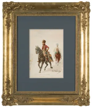 Jan Chełmiński (Brzustów k. Opoczna 1851 – Nowy Jork 1925) popularny malarz z kręgu „polskich monachijczyków“, naukę rozpoczął u Juliusza Kossaka, a następnie kształcił się w warszawskiej Klasie Rysunkowej oraz w Monachium - w Akademii u Alexandra Strähubera i Alexandra Wagnera (1873-1875) i prywatnych pracowniach Józefa Brandta (1875) i batalisty Franza Adama (1876). Po studiach przebywał już stale za granicą - w Monachium, Londynie (lata 1882, 1888-1899), Paryżu (1899), jeździł do Petersburga (1889) i Nowego Jorku (1884), gdzie później, około 1915 zamieszkał na stałe. Nie zerwał jednak kontaktów z krajem, a swoje prace często przesyłał na warszawskie wystawy. Jego obrazy cieszyły się ogromnym powodzeniem. Malował przede wszystkim sceny wojskowe i batalistycznie, najchętniej z czasów Księstwa Warszawskiego i wojen napoleońskich, a także obrazy rodzajowe i epizody z polowań. Zajmował się ilustracją książkową; m.in. ilustrował tom myśliwskich opowiadań Theodora Roosevelta. Był kolekcjonerem dawnej broni i wybitnym znawcą żołnierskiego umundurowania. Wiele obrazów artysty wciąż znajduje się za granicą - w Anglii, Niemczech czy Stanach Zjednoczonych. Nieliczne z nich pojawiają się w sprzedaży antykwarycznej, stale budząc żywe zainteresowanie zbieraczy.