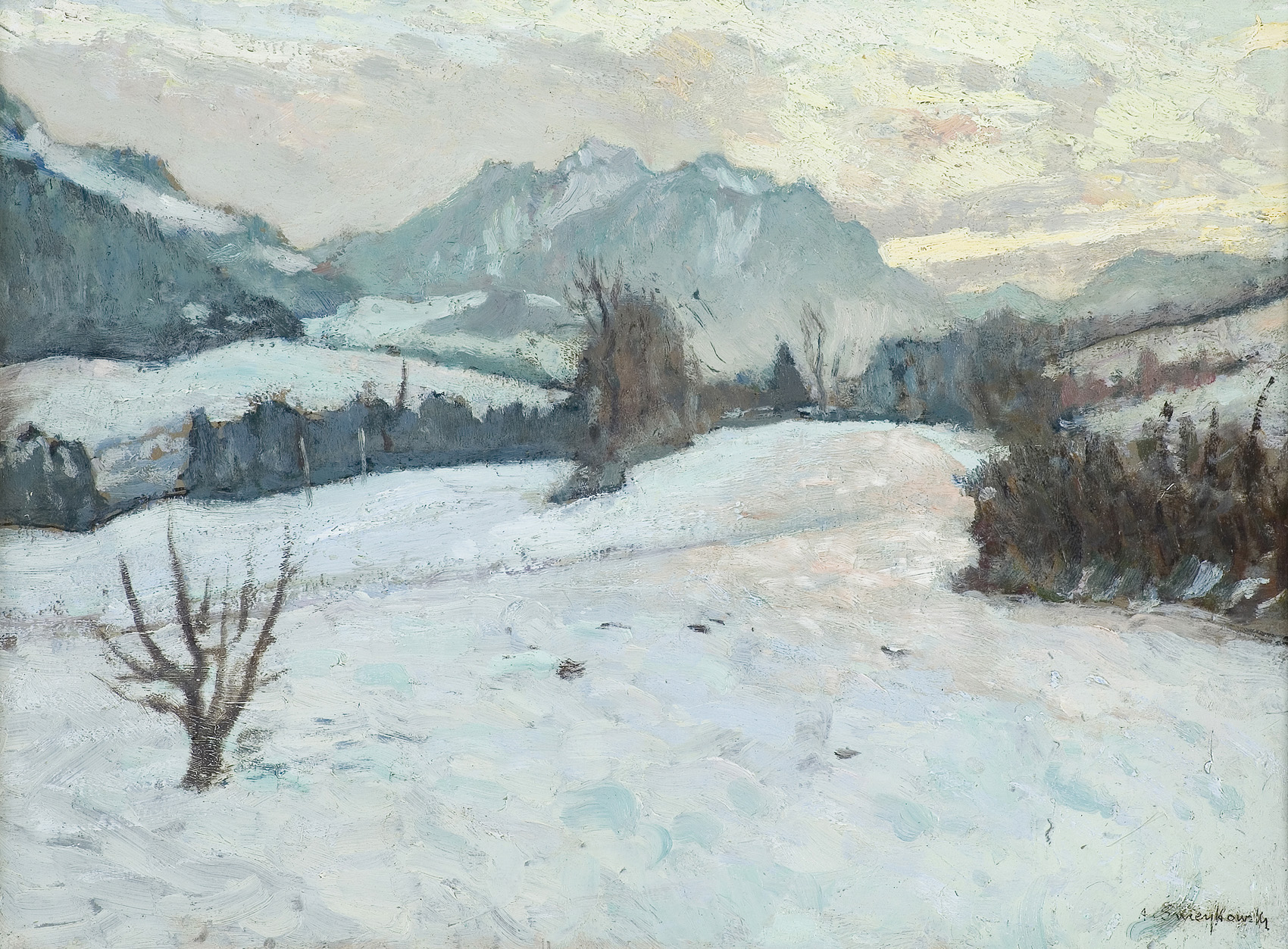 ALFRED ŚWIEYKOWSKI (Paryż 1869 – Paryż 1953) francuski malarz, którego ojcem był polski emigrant. Malarstwa uczył się w Państwowej Wyższej Szkole Sztuk Pięknych u Fernanda Cormona. Brał udział w licznych Salonach Artystów Francuskich między 1894 a 1921 rokiem. W 1937 roku zdobył złoty medal podczas swojej indywidualnej wystawy. Był malarzem wszechstronnym, który oprócz pejzaży (m.in. z Paryża, Normandii, czy Alp) malował również portrety, martwe natury oraz wnętrza.