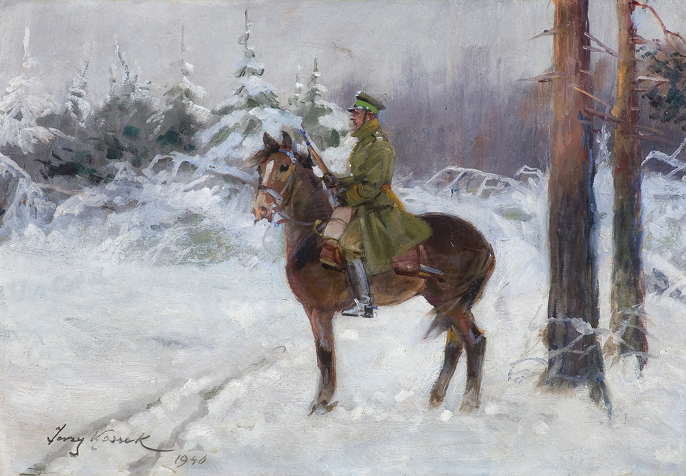 Jerzy Kossak (Kraków 1886 - Kraków 1955)- syn Wojciecha, wnuk Juliusza Kossaków - od wczesnego dzieciństwa malował pod kierunkiem ojca i dziadka. Kontynuator i naśladowca ich sztuki tworzył sceny batalistyczne, historyczne i rodzajowe z wszechobecnym motywem konia. Malował obrazy z powstania listopadowego, wojen napoleońskich oraz wiele scen z wojny 1920 roku. Najbardziej znaną jego kompozycją tego rodzaju był Cud nad Wisłą. Malował też liczne Pogonie i Pościgi ułanów za kozakami, Napady wilków, Polowania i Wesela. Tematyka tych prac sprawia, że stale cieszą się zainteresowaniem zbieraczy i publiczności, zawsze tłumnie odwiedzającej wystawy malarstwa Kossaków.