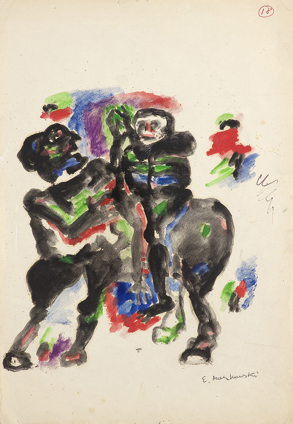 Eugeniusz Markowski (Warszawa 8 XI 1912 - Warszawa 24 II 2007) studiował w warszawskiej ASP, dyplom u prof. Tadeusza Pruszkowskiego uzyskał w 1939. Brał udział w kampanii wrześniowej i obronie Warszawy. W latach 1940-1950 przebywał we Włoszech, gdzie związał się z grupą Libera Associazione Arti Figurative i z Art Club w Rzymie. Zajmował się też projektowaniem scenografii dla rzymskiego Teatro delle Arti. Był dziennikarzem i dyplomatą we Włoszech i Kanadzie (1945-1955). Po powrocie do kraju był dyrektorem Biura Współpracy Kulturalnej z Zagranicą Ministerstwa Kultury i Sztuki (1960-1969), następnie wykładowcą i profesorem ASP w Warszawie (1969-1984). Współ-pracował jako scenograf z Operą Gdańską i teatrami warszawskimi. W 1963 reprezentował Polskę na Biennale w Sao Paulo, miał kilka wystaw indywidualnych. Jego ekspresyjny styl malowania, bezpośredniość i pewna rubaszność figuratywnych przedstawień walk i zmagań spowodowały, że w latach 80. uznano go za prekursora „nowodzikich".