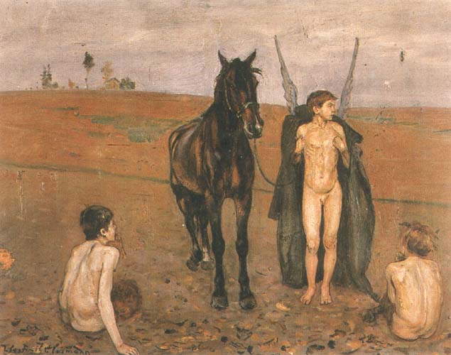 Wlastimil Hofman / Vlastimil Hofmann (Praga 1881 - Szklarska Poręba 1970) studiował w krakowskiej Szkole Sztuk Pięknych - początkowo pod kierunkiem Floriana Cynka, później także u Jana Stanisławskiego, Leona Wyczółkowskiego i Jacka Malczewskiego. W latach 1899-1902 uczył się jeszcze u Jeana Léona Gérôme’a w paryskiej École des Beaux-Arts. W czasie I wojny światowej przebywał w Pradze i w Paryżu; od 1920 stale mieszkał w Krakowie. Dużo wystawiał; należał do wielu stowarzyszeń twórczych - był współzałożycielem „Grupy Pięciu” (1905) i „Grupy Zero” (1908), członkiem Związku Artystów Czeskich „Manes”, a od 1911 członkiem Tow. Artystów Polskich „Sztuka”. W czasie II wojny światowej poprzez ZSRR i Turcję przedostał się do Jerozolimy, skąd w roku 1946 wrócił do Krakowa. Od roku 1947 stale mieszkał w Szklarskiej Porębie. Hofman malował przede wszystkim fantastyczno-symboliczne kompozycje o motywach ludowych oraz sceny rodzajowe, portrety i pejzaże. Jego obrazy mimo bliskich analogii i powiązań ze sztuką Malczewskiego odznaczają się zawsze indywidualnym charakterem, stylem i nastrojem.