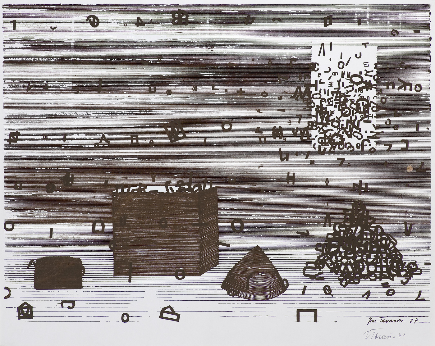 Jan Tarasin (Kalisz 11 IX 1926 - Warszawa 8 VIII 2009) studiował malarstwo w ASP w Krakowie pod kierunkiem prof. Zbigniewa Pronaszki (1946-1951). Jeszcze jako student zadebiutował na I Wystawie Sztuki Nowoczesnej w Krakowie w 1948/49. W połowie lat 50. stworzył cykle litografii: „Nowa Huta i jej mieszkańcy“, 1954, „Dom“, 1955). W pierwszym przeciwstawił się oficjalnemu optymizmowi, w drugim, operując symboliką martwej natury, zawarł treści egzystencjalne i odnoszące do niedawnego dramatu wojny. Po 1956 zaczął malować obrazy niefiguratywne. Układy wyodrębnionych elementów (określanych jako „przedmioty“) umieszczane były przez artystę na płaszczyźnie (cykl „Wnętrze“, 1957) ), lub w aluzyjnej przestrzeni (cykle „Uczta“, 1957, „Brzeg“, 1962-1964, „Przedmioty policzone“, od 1968, „Antykwariat“, 1968). Zasada ta utrzymuje się w jego malarstwie w następnych latach, różnice między okresami twórczości dotyczą sposobu opracowania „przedmiotów“ i ich usytuowania w przestrzeni obrazu lub wobec tła. Od lat 70. „przedmioty“ zmieniają się w graficzne, zwykle czarne znaki na jasnych tłach (cykl „Kolekcja“, od 1971). Tła z kolei bywają iluzyjnie przestrzenne, zróżnicowane walorowo, miękkie. W latach 90. artysta wrócił do kolorystycznego, bardziej malarskiego rozwiązywania zarówno znaków, jak i teł, często ciemnych lub przenikających się z „przedmiotami“ (cykl „Wylęgarnia przedmiotów“, 1992). Tarasin od 1962 jest członkiem „Grupy Krakowskiej“. W 1963-67 uczył na Wydziale Architektury Wnętrz krakowskiej ASP. W 1967 przeniósł się do Warszawy, w 1974 podjął pracę pedagogiczną na Wydziale Malarstwa ASP w Warszawie. W 1987-90 był rektorem tej uczelni. W 1976 otrzymał Nagrodę Krytyki Artystycznej im. Cypriana Kamila Norwida, w 1984 Nagrodę im. Jana Cybisa.; Nagroda na MB Sztuki w San Marino 1965. Równolegle z malarstwem zajmował się rysunkiem i grafiką - do lat 60. litografią, od 1974 serigrafią. W 1974-1981 wydał 8 autorskich „Zeszytów“ z serigrafiami i własnymi tekstami. W 1995 w Galerii Zachęta odbyła się wystawa artysty, której towarzyszył monograficzny katalog.