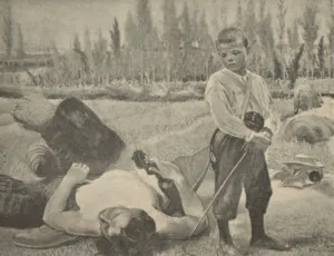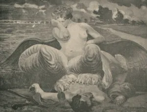 Ta „Chimera“ kochanka pół-zwierzę-kobieta, lubieżnie rozsiadła się śród pól, śród ruin i zagonów, młodą runią barwionych, śród natury bogatej a bujnej, czarownej, przesyconej poezyą nieuchwytnej zmysłowości. Kosmate, kocie swe uda rozwarła, głowę o antycznej fryzurze zwróciła w stronę młodego wyrostka. – Wiejskie stworzenie gęsi pasało tuż... Tuż obok, nad strugą i na fujarce grywał, o niczem nie wiedząc, głosem gęśli Chimery zwabiony, nadbiegł i słucha, słucha, dziwuje się... „nie wiedzący co się to właściwe dzieje“... A straszna pani gra mu jakąś nową nutę, i to taką,