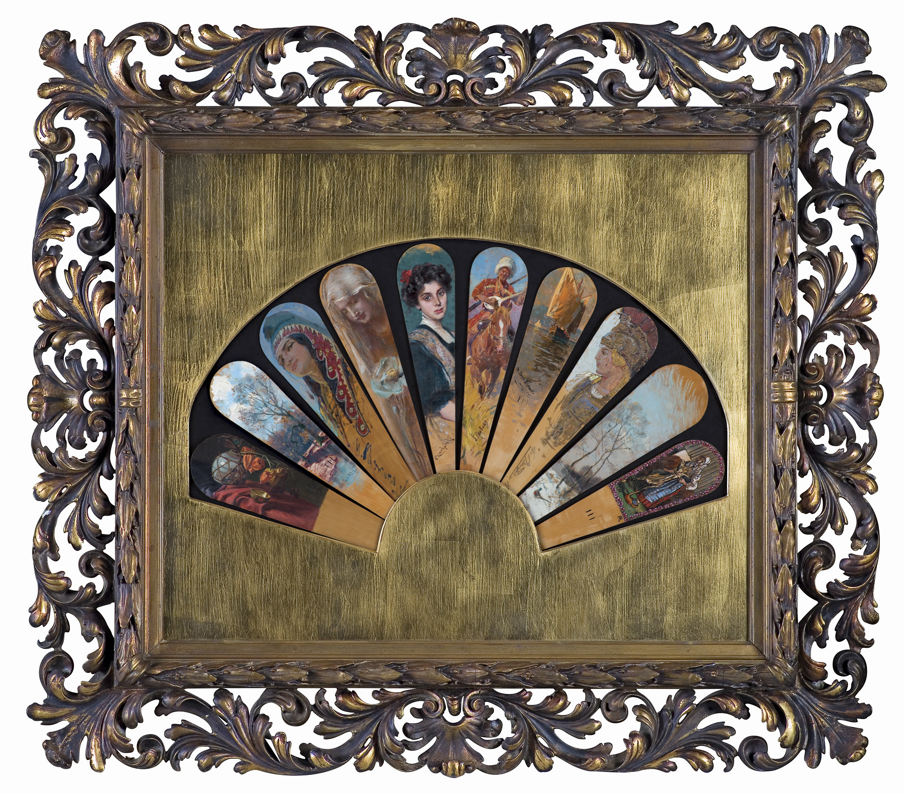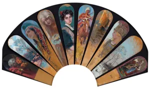 Wachlarz złożony z 10 drewnianych piór, oprawionych w ozdobną ramę, malowanych przez dziewięciu malarzy pochodzących z różnych krajów. Wszystkie pióra są sygnowane.