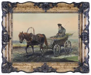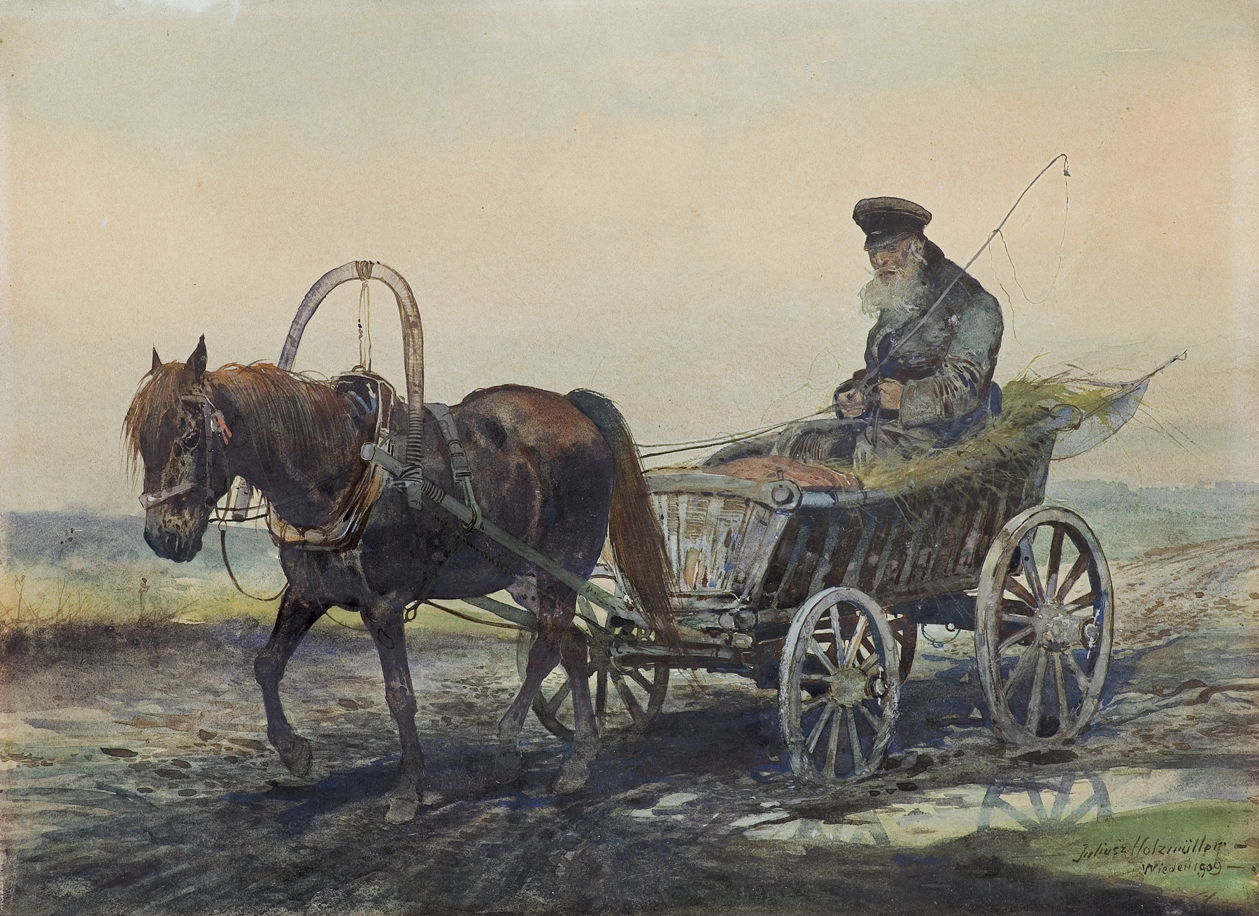Juliusz Holzmüller (Bolechów, Ukraina 1876 - Lwów 1932) po ukończeniu kursu malarstwa dekoracyjnego w Szkole Przemysłowej we Lwowie studiował u Floriana Cynka, Józefa Mehoffera i Teodora Axentowicza w krakowskiej Akademii Sztuk Pięknych, a w latach 1903-1904 także w Monachium. Po studiach, od 1906 stale mieszkał i tworzył we Lwowie. Jego akwarele, bo tą techniką posługiwał się najczęściej, znajdowały wielu chętnych odbiorców. Artysta malował, m.in. cykle obrazów do myśliwskiego pawilonu księcia Ottona Habsburga w Rafajłowej, cykle z wizerunkami koni z wielkich stadnin, szkice i obrazy batalistyczne z udziałem konnicy japońskiej (jedna z akwarel do dziś znajduje się w kasynie oficerskim w Tokio). Tworzył ponadto pejzaże, widoki miejskie, sceny rodzajowe z ulubionym motywem koni. Wystawiał często - we Lwowie, w krakowskim TPSP i warszawskiej Zachęcie. Jego prace znajdują się w muzeach w Krakowie, Łańcucie i we Lwowie.