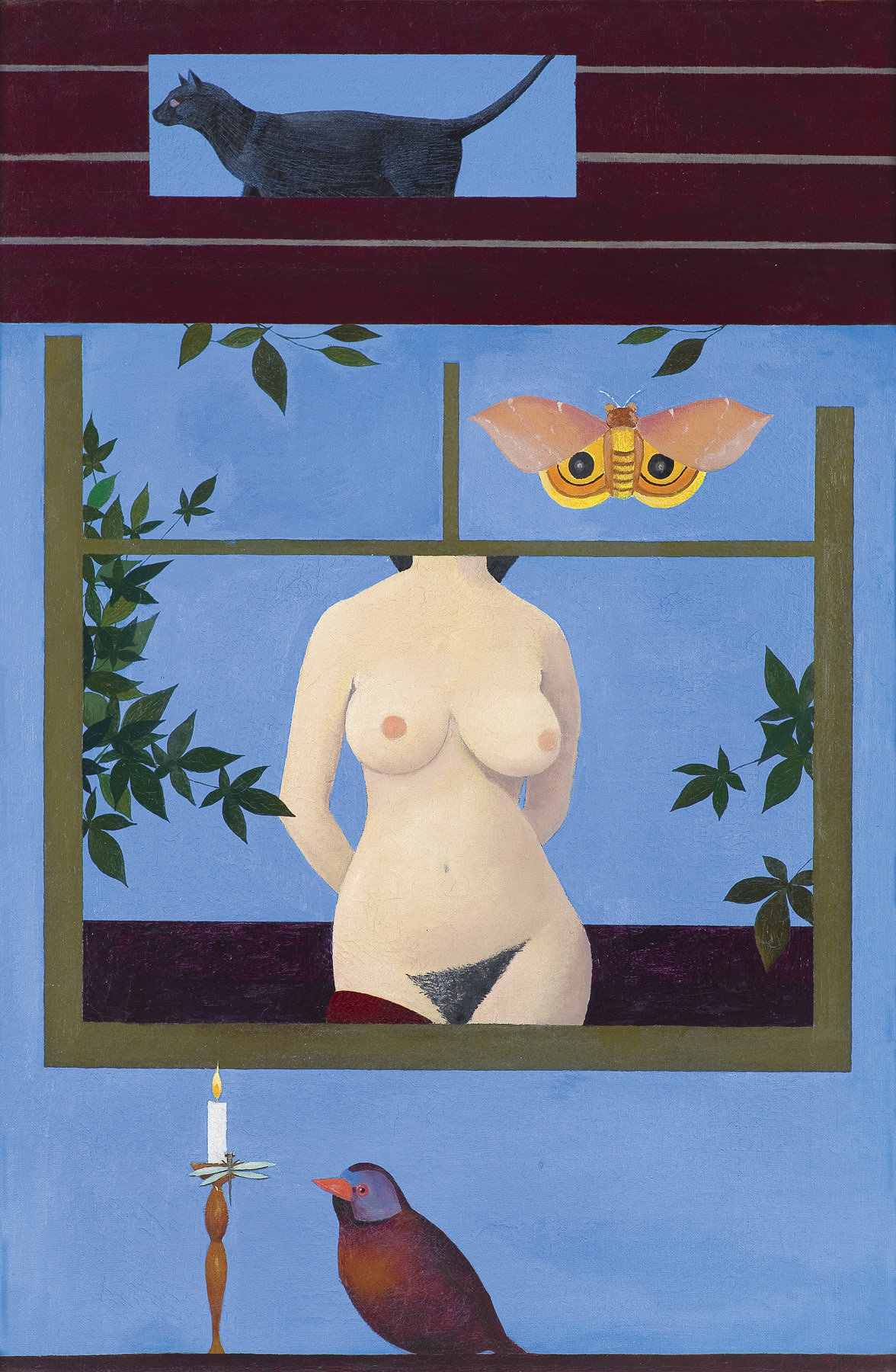 Kazimierz Mikulski (Kraków 1918 - Kraków 1998) rozpoczął studia malarskie przed II wojną światową w ASP w Krakowie, kontynuował je w latach 1939-1940 pod kierunkiem prof. Fryderyka Pautscha w Kunstgewerbeschule, powstałej za okupacji w miejsce Akademii. Po wojnie ukończył dwuletnie studia aktorskie w Studio Dramatycznym przy Starym Teatrze w Krakowie i do 1948 pracował jako aktor. Jednocześnie w 1945 ukończył Warsztat Filmowy Młodych. W latach 1948-1979 był kierownikiem plastycznym i scenografem Teatru Groteska w Krakowie, dla którego projektował lalki, kostiumy, dekoracje itp. Równolegle cały czas zajmował się malarstwem i działalnością w kręgu Tadeusza Kantora, zrazu jako członek Gru-py Młodych Plastyków, a od 1957 w Grupie Krakowskiej, której był współzałożycielem i prezesem w latach 1965-1967. Był też członkiem zespołu teatru Cricot 2, grał m.in. w spektaklach Kurka wodna, Nadobnisie i koczkodany, Umarła klasa oraz we własnej sztuce Cyrk. W swych obrazach z drugiej poł. lat 40. artysta przedstawiał lekkie, linearne formy unoszące się w pustych przestrzeniach. Było to malarstwo zarazem surrealistyczne i abstrakcyjne. Lecz już ok. 1950 zaczął malować w charaktery-styczny dlań sposób - odrzucając abstrakcję, prezentował niezliczone warianty i układy kilku ulubionych motywów (głowa lub postać kobiety-lalki, koty, motyle).