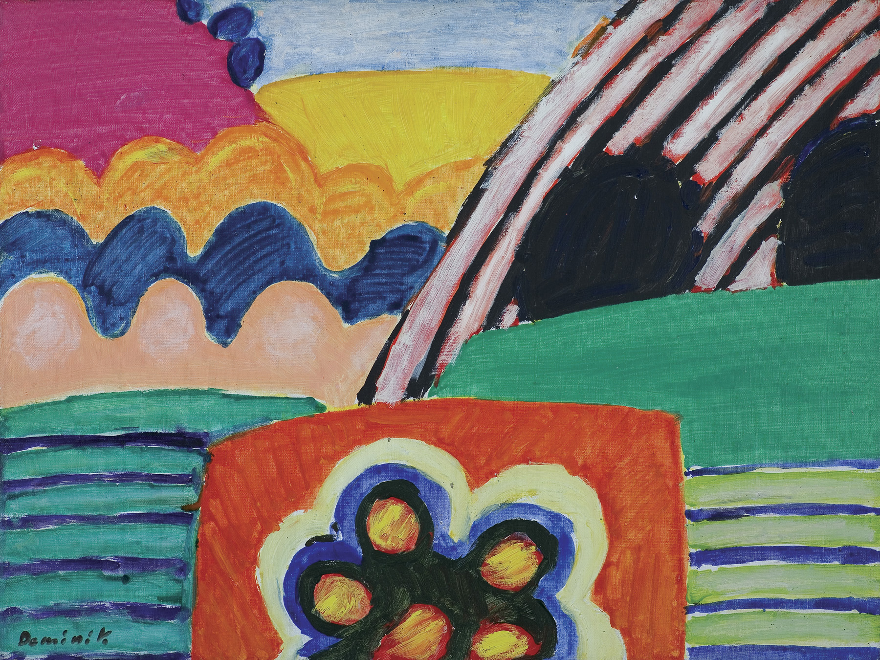 Tadeusz Dominik (Szymanów 14 I 1928 - Warszawa 20 V 2014) studiował na Wydziale Malarstwa ASP w Warszawie pod kierunkiem prof. J.Cybisa (1946-51, dyplom 1953). Od 1951 był pedagogiem na macierzystym Wydziale, początkowo jako asystent Cybisa. Od 1965 prowadził własną pracownię, w 1979 otrzymał tytuł profesora. W 1990 przeszedł na emeryturę. W czasie studiów oddziałały nań - za pośrednictwem osobowości i sztuki Cybisa - idee polskiego koloryzmu, które następnie twórczo i samodzielnie kontynuował. Początkowo tworzył obrazy figuratywne. Debiutował na słynnej wystawie w warszawskim Arsenale w 1955, gdzie zdobył nagrodę. W tym okresie obok malarstwa uprawiał drzeworyt, operujący szerokimi płaszczyznami bieli i czerni (drzeworyty wystawiał m.in. na Biennale w Wenecji w 1956). W drugiej poł. lat 50. zaczął malować obrazy abstrakcyjne, początkowo utrzymane w ekspresyjnej i spontanicznej stylistyce malarstwa informel. W latach 60. wzbogacił swe prace o efekty fakturowe. Niezmienną inspiracją była dla malarza natura, bogactwo i kolorystyka jej form. Pozostał jej wierny do dziś, poddając zmianom sam sposób malowania. Stopniowo rozjaśniał i wygładzał swe kompozycje, wprowadzając efekty dekoracyjne, jak rytmiczne powtórzenia form czy rodzaj malowanych „rastrów“, regularnie znaczących fragmenty kompozycji. Wśród wielu nagród otrzymał m.in. laur „Złotego Grona“ w Zielonej Górze w 1963, Grand Prix Festiwalu Polskiego Malarstwa Współczesnego w Szczecinie w 1968, nagrodę im. George’a Rowney’a w Londynie w 1973 i Nagrodę im. Jana Cybisa w Warszawie w 1973. Równolegle z malarstwem zajmował się gobelinem, ceramiką, również grafiką komputerową.