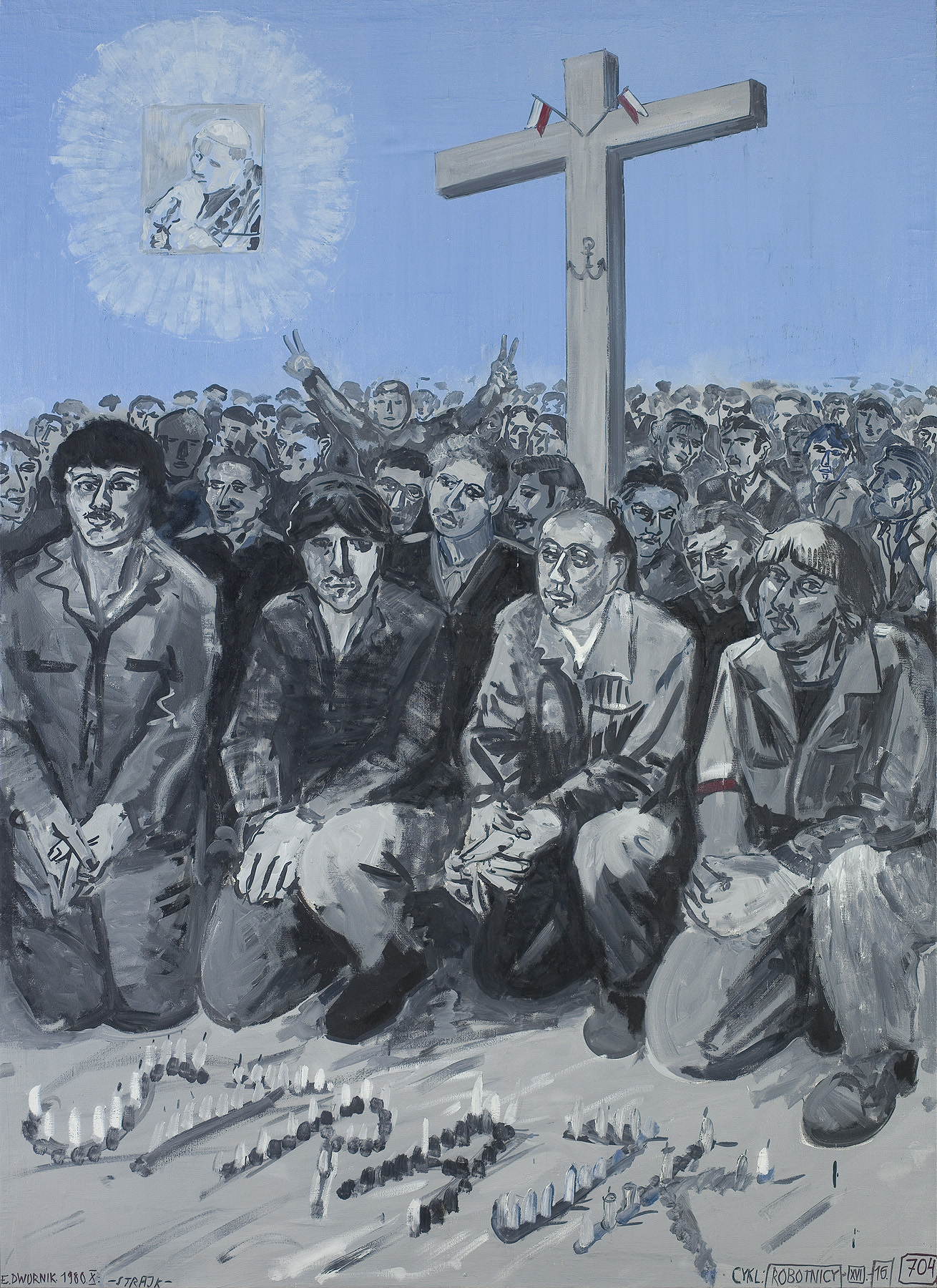 Edward Dwurnik (Radzymin 19 IV 1943 - Warszawa 28 X 2018) studiował malarstwo w ASP w Warszawie (1963-1970), jednak jako swego „mistrza“ wymienia Nikifora. Jego to prace, zobaczone po raz pierwszy w 1965, zainspirowały ówczesnego studenta III roku do narysowania pierwszych prac z cyklu „Podróże autostopem“, które kontynuował w nastepnych latach. W 1972-1978 powstawał cykl „Sportowcy“, w którym portretowane były, dodajmy - kąśliwie, typowe postaci z lat 70. Równolegle od 1975 powstawał cykl „Robotnicy“, który kulminował w okresie „Solidarności“ 1980-1981. Za prace z tego cyklu Dwurnik otrzymał w 1981 Nagrodę Krytyki Artystycznej im. Cypriana Kamila Norwida, natomiast za obrazy z cyklu „Warszawa“ (1981), proroczo zapowiadające stan wojenny - Nagrodę Kulturalną „Solidarności“ podziemnej w 1983. W latach 80. malarstwo Dwurnika przybrało wyraz ekspresyjny i dramatyczny. Powstające w tej dekadzie obrazy miały niejednokrotnie wymowę polityczną, przybierały też kostium historyczny, tak czy inaczej odnoszący się do współczesnych spraw i realiów. Cykl „Droga na Wschód“ (1989-91) upamiętniał ofiary stalinizmu, natomiast cykl „Od Grudnia do Czerwca“ (1990-94) - ofiary stanu wojennego. Zarówno ideowe, jak i czysto malarskie walory tych prac przyniosły artyście ogromne uznanie, zarówno w kraju jak i za granicą. Jego wyrazem była prestiżowa nagroda Fundacji Coutts & Co w Zurychu (1992). W latach 90. powstają cykle będące kontynuacją „Podróży autostopem“: „Niebieskie miasta“ (od 1993) i „Diagonale“ (od 1996), jak również kompozycje nowego typu, jak widoki morskie (cykl „Błękitne“, 1992-93) czy cykl „Wyliczanka“ (1996-99). Artysta wiele wystawia, miał ok. 100 wystaw indywidualnych w Polsce i za granicą, brał też udział w licznych wystawach i festiwalach krajowych i międzynarodowych, m.in.: X Biennale Sztuki Współczesnej, Menton 1974, Documenta 7, Kassel 1982, 5th Biennale, Sydney 1985, XIX Biennale Sztuki, Sao Paulo 1987; Olimpiada Sztuki, Seul 1988. Równolegle z malarstwem uprawiał rysunek, collage, grafikę warsztatową (litografia, techniki metalowe, kserografia, stemple) i użytkową (ilustracja, plakaty do własnych wystaw indywidualnych).