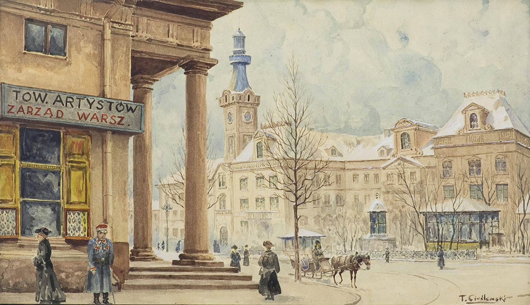 Tadeusz Cieślewski (Warszawa 1870 – Warszawa 1956) - ojciec grafika Tadeusza Cieślewskiego - studia artystyczne rozpoczął w warszawskiej Szkole Rysunkowej pod kierunkiem W. Gersona i J. Kauzika. W latach 1895-1896 kształcił się w Paryżu w Académie Vitti oraz u E. Aman-Jeana i R. Collina. W 1900 podróżował do Włoch i krótko studiował w Akademii rzymskiej. Stale mieszkał w Warszawie, aktywnie uczestnicząc w życiu artystycznym miasta. Debiutował na wystawie w warszawskiej Zachęcie w roku 1897; w 1898 otrzymał srebrny medal w konkursie na serię pocztówek warszawskich. Od 1906 był członkiem TZSP kilkakrotnie pełniąc funkcję wiceprezesa tego Towarzystwa. W 1929 otrzymał srebrny medal TZSP, w roku 1935 wyróżniono go dyplomem honorowym. Był współzałożycielem stowarzyszenia Sztuka i Rzemiosło (1904), należał do ugrupowania Pro Arte. Dużo wystawiał; przede wszystkim w Warszawie – w Zachęcie oraz, m.in. w Salonach Richlinga, Garlińskiego, Salonie Sztuki. Brał udział w wystawach sztuki polskiej za granicę – w 1924 w Moskwie, w 1936 na XX Biennale w Wenecji, w 1939 w Nowym Jorku. W czasie powstania warszawskiego utracił większość swego dorobku artystycznego. Kilka lat powojennych spędził w Piotrkowie, ale w 1948 wrócił do Warszawy. Był przede wszystkim malarzem architektury, szczególnie chętnie malował widoki ulic i placów Warszawy. Rzadziej tworzył pejzaże, martwe natury, portrety i kompozycje figuralne. Jego ulubioną techniką była akwarela, ale malował także olejno i pastelami. Dwukrotnie – w 1928 i 1951 – otrzymał nagrodę miasta Warszawy; odznaczony był także Złotym Krzyżem Zasługi oraz Krzyżem Oficerskim i Komandorskim orderu Odrodzenia Polski.