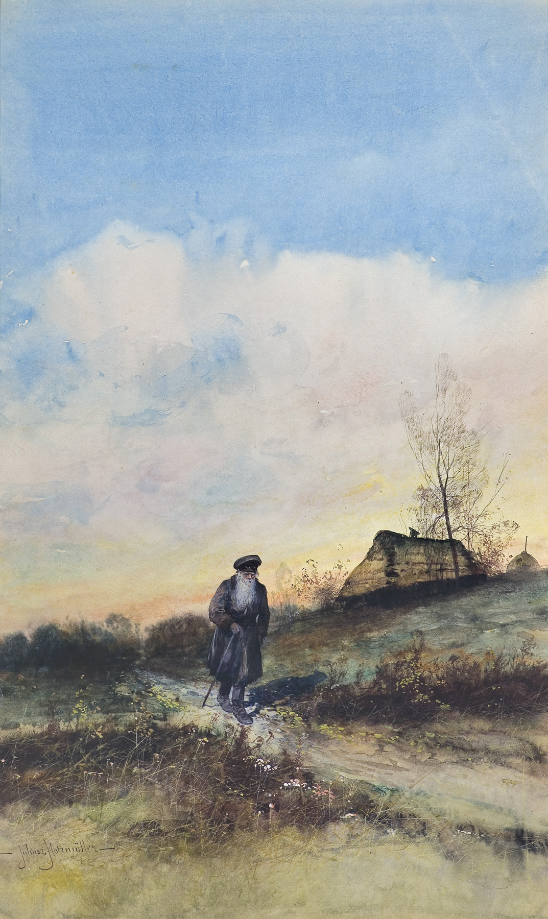 Juliusz Holzmüller (Bolechów, Ukraina 1876 - Lwów 1932) po ukończeniu kursu malarstwa dekoracyjnego w Szkole Przemysłowej we Lwowie studiował u Floriana Cynka, Józefa Mehoffera i Teodora Axentowicza w krakowskiej Akademii Sztuk Pięknych, a w latach 1903-1904 także w Monachium. Po studiach, od 1906 stale mieszkał i tworzył we Lwowie. Jego akwarele, bo tą techniką posługiwał się najczęściej, znajdowały wielu chętnych odbiorców. Artysta malował, m.in. cykle obrazów do myśliwskiego pawilonu księcia Ottona Habsburga w Rafajłowej, cykle z wizerunkami koni z wielkich stadnin, szkice i obrazy batalistyczne z udziałem konnicy japońskiej (jedna z akwarel do dziś znajduje się w kasynie oficerskim w Tokio). Tworzył ponadto pejzaże, widoki miejskie, sceny rodzajowe z ulubionym motywem koni. Wystawiał często - we Lwowie, w krakowskim TPSP i warszawskiej Zachęcie. Jego prace znajdują się w muzeach w Krakowie, Łańcucie i we Lwowie.