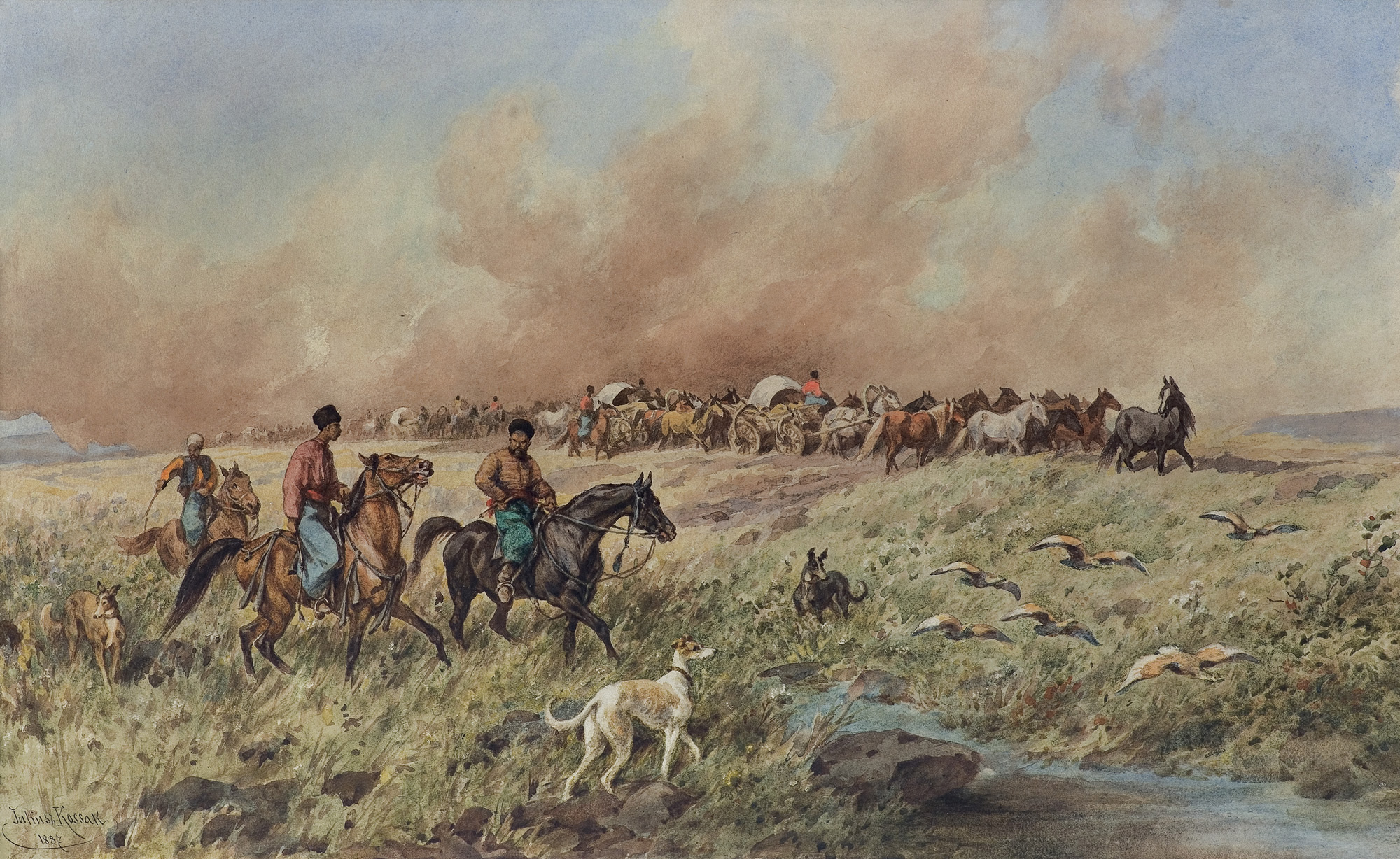 Juliusz Kossak (Wiśnicz 1824 - Kraków 1899) - malarz i ilustrator - był jednym z najpopularniejszych artystów polskich 2. połowy XIX wieku. Naukę rysunku i malarstwa rozpoczął we lwowskiej pracowni Jana Maszkowskiego; później wiele rysował z natury odwiedzając majątki szlacheckie na Ukrainie, Podolu i Wołyniu. W roku 1852 był w Wiedniu, na Węgrzech i w Petersburgu, a następnie zamieszkał na stałe w Warszawie. Lata 1856-1860 spędził w Paryżu, gdzie przyjaźnił się z Horacem Vernetem. Powróciwszy do Warszawy w latach 1862-1868 był kierownikiem artystycznym „Tygodnika Ilustrowanego”. W roku 1869 przeniósł się na stałe do Krakowa, skąd wyjeżdżał jeszcze do Monachium, by malować w atelier batalisty Franza Adama. Kossak był przede wszystkim znakomitym akwarelistą; rzadziej posługiwał się techniką olejną. Malował obrazy historyczne i batalistyczne, sceny rodzajowe ilustrujące życie i tradycje dworu szlacheckiego oraz obyczaje polskiego ludu. Ale prawdziwymi bohaterami jego obrazów były konie, których ruch, temperament, charakter i indywidualność potrafił po mistrzowsku przedstawić. Był także autorem wielu ilustracji do czasopism i książek, trafiającym bezbłędnie tak w klimat utworów literackich, jak i w tęsknoty i potrzeby odbiorców - czytelników Pieśni o ziemi naszej Wincentego Pola, Trylogii Henryka Sienkiewicza, Pana Tadeusza i poematów Adama Mickiewicza.