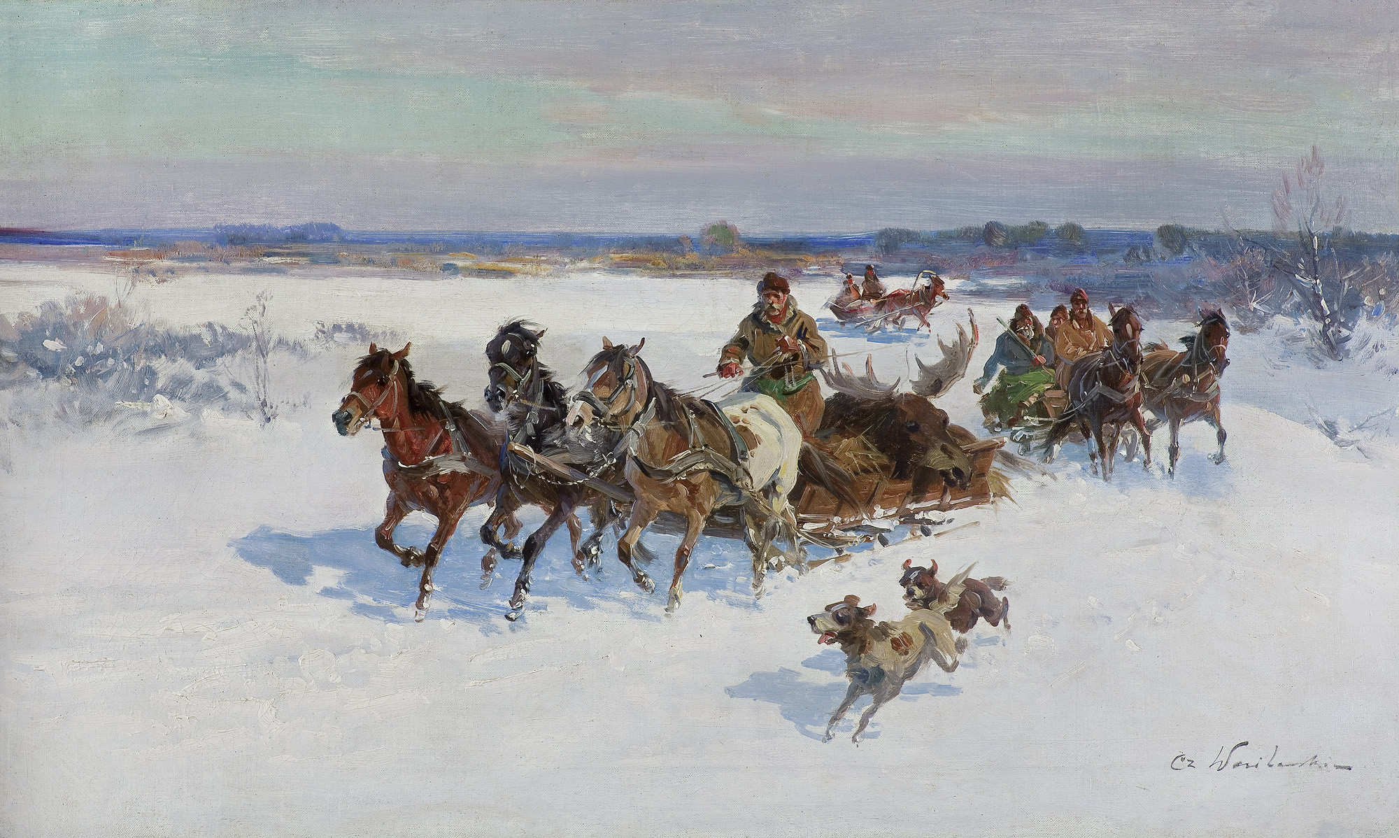Czesław Wasilewski (ok. 1875 - Warszawa/ Łódź 1946?47) to popularny w okresie międzywojennym warszawski malarz, autor obrazów inspirowanych płótnami Kossaka, Brandta, Chełmońskiego, Wierusza-Kowalskiego czy Fałata. Był samoukiem; wprawdzie w 1911 zapisał się do warszawskiej Szkoły Sztuk Pięknych, ale o jego studiach nic bliższego nie wiadomo. Być może uczęszczał tam (1913-1917) do pracowni Wojciecha Kossaka, dla którego później, na początku lat dwudziestych, przygotowywał podmalówki do obrazów. Uczestniczył w wystawie w Lublinie (1922), wystawiał na Salonach warszawskiej Zachęty (1925,1926, 1927), w Katowicach (1926), Częstochowie (1927), Gdyni (1929), Kaliszu (1931), Poznaniu (1928, 1931). Malował przede wszystkim liczne zaprzęgi, sanny, wyjazdy na polowania, wypadki w podróży, ułanów na patrolu, łosie, sarny i dziki w lesie. Tworzył także nastrojowe pejzaże, wyraźnie inspirowane malarstwem J. Chełmońskiego Rzadziej malował także kwiaty i martwe natury. Utożsamiany z malarzem o nazwisku „Zygmuntowicz”, którego prace pojawiały się na rynku sztuki od trzydziestych lat XX wieku. Stawiany przed tym nazwiskiem inicjał I. lub F., sugerować może imię Ignacy lub Franciszek. Sylwetkę malarza bliżej omówił S. Bołdok w artykule Malarz o dwóch nazwiskach (Art and Business 1992, nr 7-8, s. 48-49).