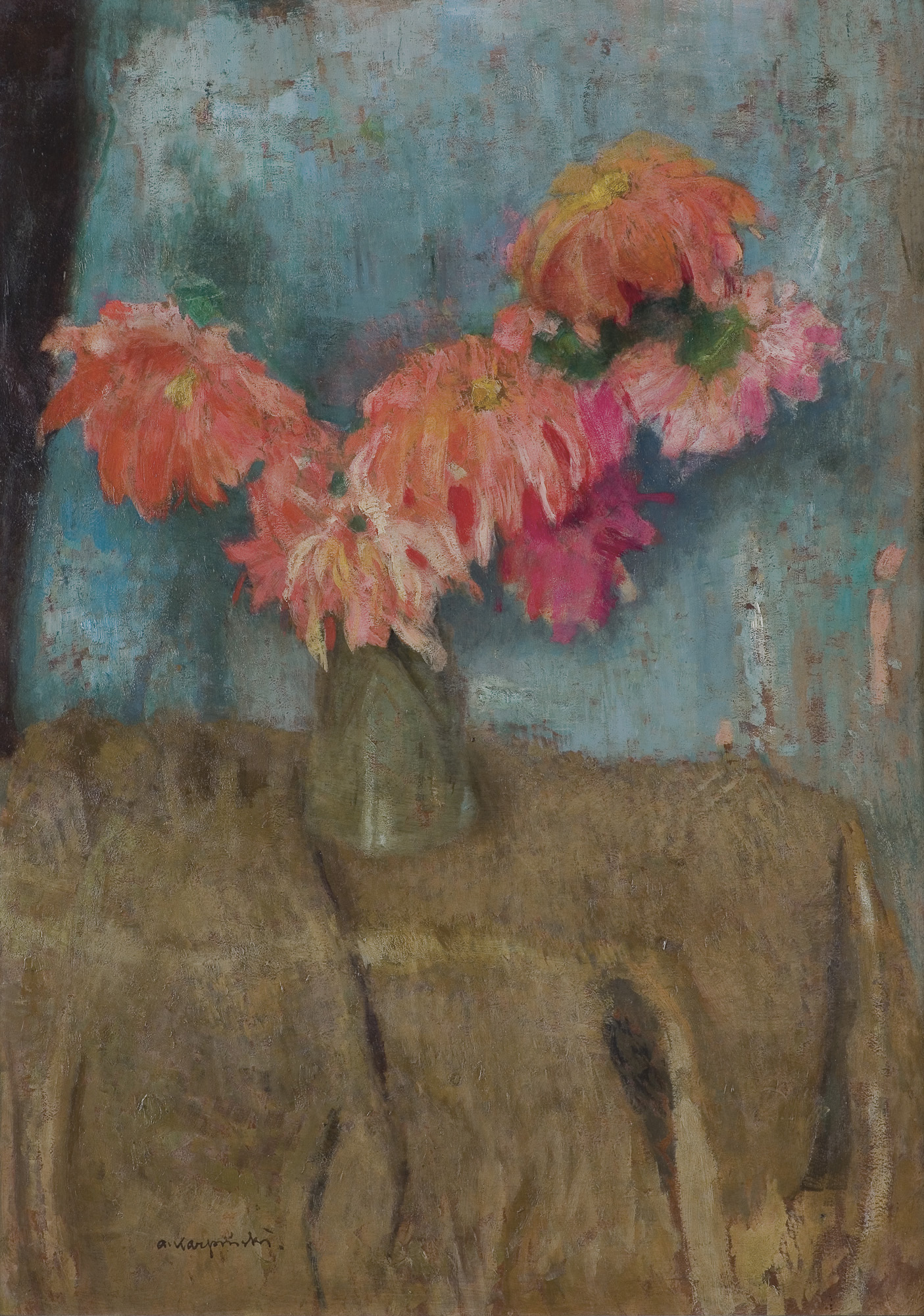 Alfons Karpiński (Rozwadów, dziś dzielnica Stalowej Woli 1875 - Kraków 1961) w latach 1891-1899 studiował w krakowskiej Szkole Sztuk Pięknych pod kierunkiem Floriana Cynka, Izydora Jabłońskiego, Władysława Łuszczkiewicza i Leona Wyczółkowskiego, a następnie kształcił się jeszcze u Antona Ažbégo w Monachium (1903), u Kazimierza Pochwalskiego w Wiedniu, a od 1907 także w Paryżu. Podróżował do Włoch i Londynu. Stale mieszkał w Krakowie; związany z tamtejszym środowiskiem skupionym wokół „Zielonego Balonika” projektował dekoracje do przedstawień kabaretu. Należał do Tow. Artystów Polskich „Sztuka”, grupy „Zero”, był członkiem wiedeńskiego stowarzyszenia „Secesja” i krakowskiego TPSP. Uczestniczył w wielu wystawach w kraju i za granicą. W czasie I wojny światowej służył w armii austriackiej. Na bogatą twórczość artysty składają się wczesne sceny rodzajowe z podkrakowskiej wsi, pejzaże i portrety, wśród nich zwłaszcza portrety kobiece, które przyniosły mu szczególną popularność. Z czasem głównym – obok portretu – tematem jego obrazów stały się martwe natury z kwiatami, dekoracyjne kompozycje o stonowanej gamie barwnej. Artysta zajmował się także grafiką i ilustratorstwem.