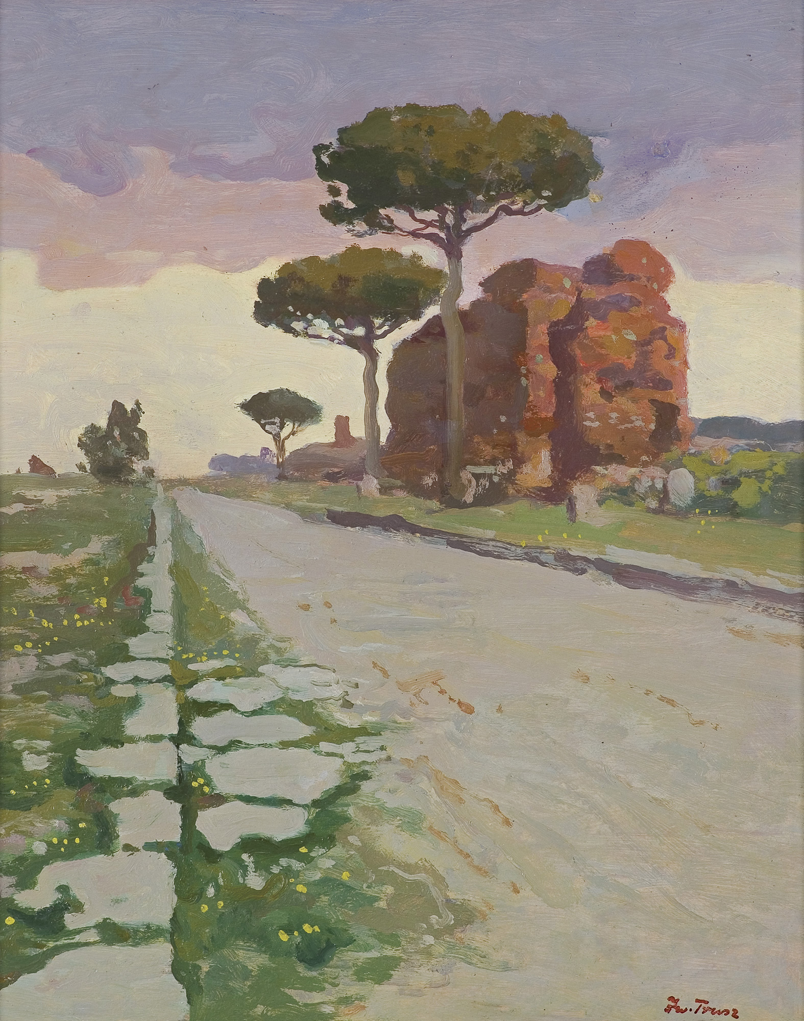 Iwan Trusz (Wysocko 1869 - Lwów 1941) studiował w Krakowskiej Szkole Sztuk Pięknych u I. Jabłońskiego, W. Łuszczkiewicza, J. Unierzyskiego, L. Loefflera, a w latach 1895-97 także u L. Wyczółkowskiego i w pracowni pejzażu J. Stanisławskiego. W 1894 wyjechał do Wiednia i jako wolny słuchacz przez kilka tygodni uczęszczał do tamtejszej ASP. W 1897 równie krótko uczył się w prywatnej szkole A. Ažbego w Monachium. Po studiach wiele podróżował - dwukrotnie, w 1902 i 1908 był we Włoszech, później też w Palestynie i Egipcie, w 1901 i 1902 jeździł na Krym, podróżował po Ukrainie. Stale mieszkał we Lwowie, gdzie w dawnym domu artysty znajduje się obecnie poświęcone mu muzeum. Był przede wszystkim pejzażystą - malował krajobrazy z dalekich podróży oraz nastrojowe pejzaże z Ukrainy. Tworzył także portrety i rodzajowe sceny o tematyce huculskiej. Uprawiał ilustratorstwo, współpracował z ukraińskim teatrem we Lwowie. Zajmował się krytyką artystyczną, pisując artykuły do ukraińskich czasopism „Buducznist“, „Literaturno-Naukowyj Wistnik“, „Artystycznyj Wistnik“ i pracując przy ich redakcji.