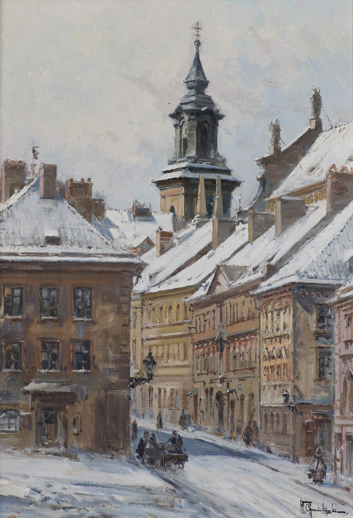 Władysław Chmieliński (Warszawa 1911 - Warszawa 1979) był malarzem związanym z Warszawą, gdzie stale mieszkał i pracował. W latach 1926-1931 studiował w warszawskiej Miejskiej Szkole Sztuk Zdobniczych i Malarstwa (dawna Klasa Rysunkowa). Wiodącym tematem jego obrazów były widoki miejskie, malowane olejno i akwarelą. W latach 1935-1938 stworzył cykl akwarel przedstawiających obiekty polskiej architektury; wśród nich, widoki Sandomierza, Krakowa, Kazimierza nad Wisłą, a także wnętrza zabytkowych kościołów czy pałaców, m.in. Zamku Królewskiego w Warszawie i Pałacu w Wilanowie. Malował także pejzaże i wiejskie sceny rodzajowe – kuligi, sanny, zaprzęgi, wesela, konie na tle krajobrazu. W latach 1967-1969 wyjeżdżał na dłuższe pobyty do Danii. W latach 1936-1939 artysta używał także pseudonimu „Władysław Stachowicz”.