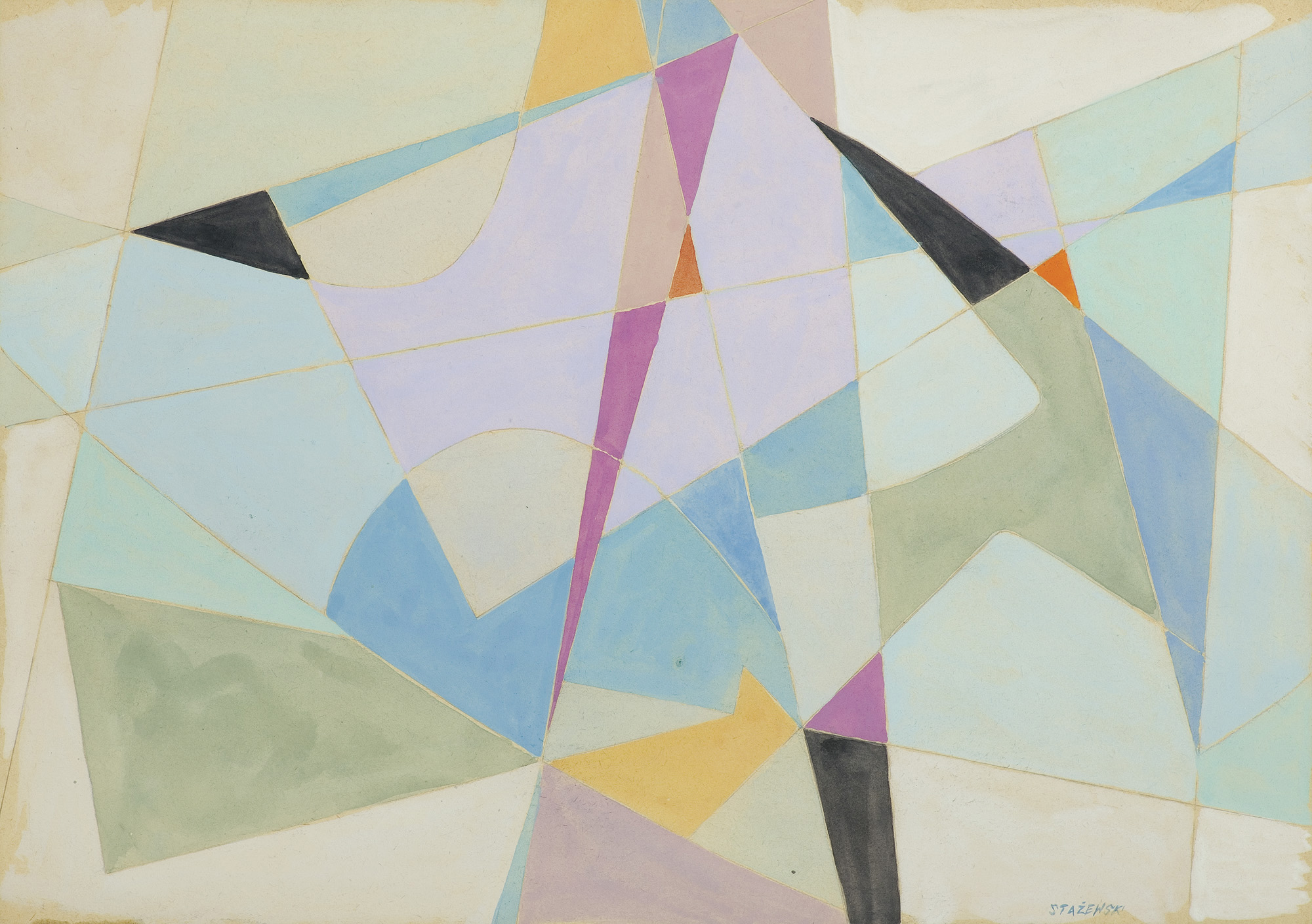 Henryk Stażewski (Warszawa 9 I 1894 - Warszawa 10 VI 1988) studiował w Szkole Sztuk Pięknych w Warszawie w latach 1913-1920. W początkach kariery malował martwe natury. Przejściowo wystawiał z ugrupowaniem „Formiści” (1922). Wziął też udział w Wystawie Nowej Sztuki w Wilnie w 1923. O tego czasu tworzył pod wpływem konstruktywizmu. Obok kompozycji malarskich trudnił się grafiką książkową, projektował wnętrza, sprzęty, a także scenografie – były to w większości prace teoretyczne i studyjne. Polskie i międzyna-rodowe ugrupowania awangardy, z którymi wystawiał i współpracował jako publicysta, to kolejno: „Blok” (1924-1926), „Praesens” (1926-1930), „Cercle et Carré” (1929-1931), „Abstraction-Création” (1931-1939), „a. r.” (1932-1939). Należał też do Koła Artystów Grafików Reklamowych (1933-1939). W 1930 był współorganizatorem zbiórki dzieł artystów międzynarodowej awangardy przeznaczonych dla muzeum łódzkiego (obecnie w Muzeum Sztuki w Łodzi). Po II wojnie mieszkał i działał w Warszawie. W latach 40. i 50. podejmował próby dostosowania się do postulatów sztuki figuratywnej. Z tego okresu pochodzą rysunkowe i malarskie kompozycje o tematyce pracy, budowy, a także projekty monumentalne. Po 1956, uznawany powszechnie za patrona polskiej awangardy, uprawiał już wyłącznie abstrakcję o konstruktywistycznym rodowodzie. Tworzył cykle prac, będących studiami płaszczyzn, linii, kolorów w różnych układach względem siebie. Przy pozorach chłodnej perfekcji umiał nasycić je emocją bezpośredniego dotknięcia, śladu ręki. Obok malarstwa i form pochodnych, jak collages, reliefy, multiple, tworzył formy przestrzenne i grafikę (autoryzował serigraficzne repliki swoich prac). Był laureatem wielu nagród i odznaczeń krajowych i zagranicznych, w tym Nagrody Herdera, Wiedeń 1972.