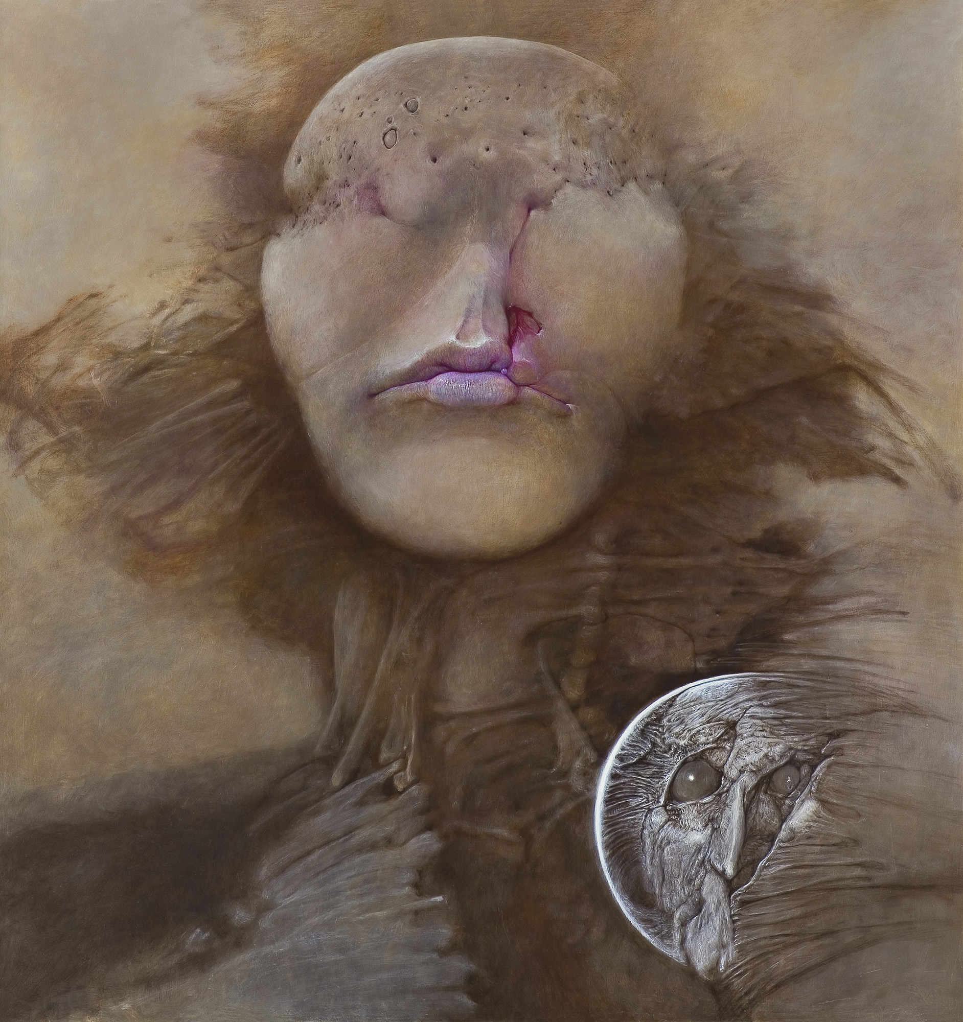 Zdzisław Beksiński (Sanok 24 II 1929 - Warszawa 21 II 2005) studiował w latach 1947-1952 na Wydziale Architektury Politechniki Krakowskiej. Był artystą samoukiem, który osiągnął niekwestionowaną pozycję w polskiej sztuce współczesnej, potwierdzoną obecnością jego prac na prestiżowych wystawach i w kolekcjach muzealnych. Początkowo zajmował się fotografią, którą interesował się od lat studenckich, po 1956 zyskując uznanie jako twórca fotogramów o estetyce opartej o efekty fakturowe. W latach 1958-1962 tworzył abstrakcyjne obrazy-reliefy o bogatej fakturze, głównie metalowe, będące odmianą malarstwa materii. Pod koniec tego okresu powstawały ażurowe formy o kształtach figur i pełnoplastyczne rzeźby w metalu. Kolejnym etapem jego twórczości były lata 1962-1974, kiedy poświęcał się głównie rysunkowi. W latach 60. rysował piórkiem i tuszem figuralne kompozycje odznaczające się karykaturalną deformacją postaci. Od końca lat 60. tworzył rysunki węglem i kredkami, będące monochromatyczną odmianą jego równoległej twórczości malarskiej. Od 1974 zajmował się niemal niepodzielnie malarstwem. Jego charakterystyczny styl bazował na perfekcji technicznej, której towarzyszyła niezwykłość wizji. Malował świat po katastrofie, naznaczony piętnem śmierci i rozpadu. Jego obrazy zaludniają postaci i stwory o ludzkich wprawdzie bądź zwierzęcych kształtach, lecz o cechach fantomów, automatów lub rozpadających się trucheł. Artysta nie nadawał swym obrazom i rysunkom tytułów (poza porządkującymi symbolami), akcentując w ten sposób swój brak zainteresowania dla literackiej strony przedstawień. Sam mówił, że malując całkowicie poddaje się wizji, „fotografuje“ ją. W ostatnich latach włączył do swego warsztatu artystycznego elektroniczne techniki generowania obrazu, które wykorzystywał do tworzenia komputerowych fotomontaży. Sztuka Beksińskiego, wielokrotnie wystawiana i omawiana, budzi skrajne emocje wśród znawców i publiczności.