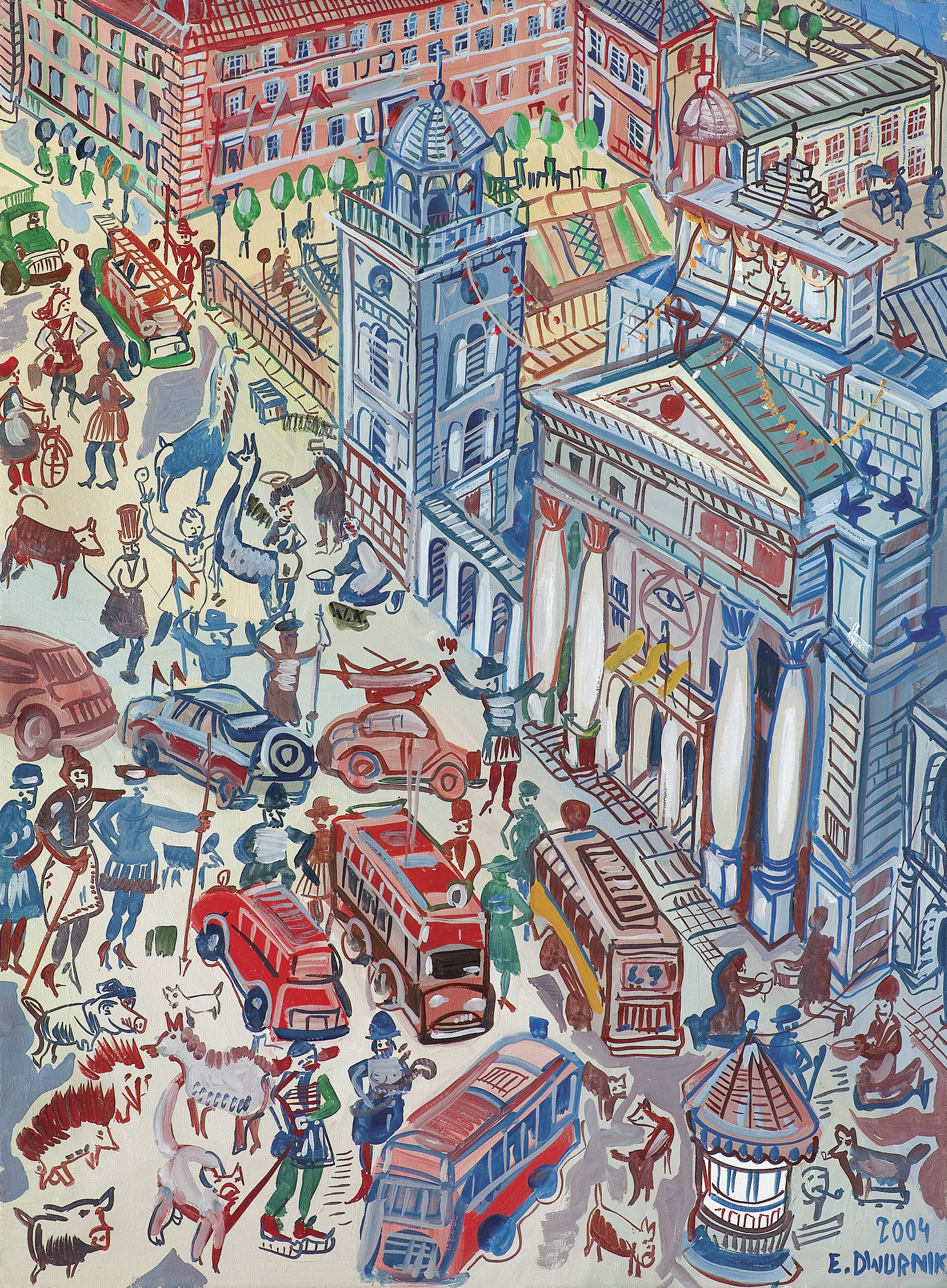 Edward Dwurnik (Radzymin 19 IV 1943 - Warszawa 28 X 2018) studiował malarstwo w ASP w Warszawie (1963-1970), jednak jako swego „mistrza“ wymienia Nikifora. Jego to prace, zobaczone po raz pierwszy w 1965, zainspirowały ówczesnego studenta III roku do narysowania pierwszych prac z cyklu „Podróże autostopem“, które kontynuował w nastepnych latach. W 1972-1978 powstawał cykl „Sportowcy“, w którym portretowane były, dodajmy - kąśliwie, typowe postaci z lat 70. Równolegle od 1975 powstawał cykl „Robotnicy“, który kulminował w okresie „Solidarności“ 1980-1981. Za prace z tego cyklu Dwurnik otrzymał w 1981 Nagrodę Krytyki Artystycznej im. Cypriana Kamila Norwida, natomiast za obrazy z cyklu „Warszawa“ (1981), proroczo zapowiadające stan wojenny - Nagrodę Kulturalną „Solidarności“ podziemnej w 1983. W latach 80. malarstwo Dwurnika przybrało wyraz ekspresyjny i dramatyczny. Powstające w tej dekadzie obrazy miały niejednokrotnie wymowę polityczną, przybierały też kostium historyczny, tak czy inaczej odnoszący się do współczesnych spraw i realiów. Cykl „Droga na Wschód“ (1989-91) upamiętniał ofiary stalinizmu, natomiast cykl „Od Grudnia do Czerwca“ (1990-94) - ofiary stanu wojennego. Zarówno ideowe, jak i czysto malarskie walory tych prac przyniosły artyście ogromne uznanie, zarówno w kraju jak i za granicą. Jego wyrazem była prestiżowa nagroda Fundacji Coutts & Co w Zurychu (1992). W latach 90. powstają cykle będące kontynuacją „Podróży autostopem“: „Niebieskie miasta“ (od 1993) i „Diagonale“ (od 1996), jak również kompozycje nowego typu, jak widoki morskie (cykl „Błękitne“, 1992-93) czy cykl „Wyliczanka“ (1996-99). Artysta wiele wystawia, miał ok. 100 wystaw indywidualnych w Polsce i za granicą, brał też udział w licznych wystawach i festiwalach krajowych i międzynarodowych, m.in.: X Biennale Sztuki Współczesnej, Menton 1974, Documenta 7, Kassel 1982, 5th Biennale, Sydney 1985, XIX Biennale Sztuki, Sao Paulo 1987; Olimpiada Sztuki, Seul 1988. Równolegle z malarstwem uprawiał rysunek, collage, grafikę warsztatową (litografia, techniki metalowe, kserografia, stemple) i użytkową (ilustracja, plakaty do własnych wystaw indywidualnych).