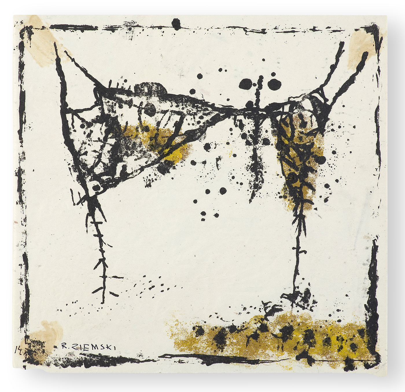 Rajmund Ziemski (Radom 1930 - Warszawa 2005) studiował malarstwo w latach 1949-1955 pod kierunkiem Artura Nachta-Samborskiego w Akademii Sztuk Pięknych w Warszawie. W roku dyplomowym wziął udział w Ogólnopolskiej Wystawie Młodej Plastyki w warszawskim Arsenale. Od 1958 wykłada w macierzystej uczelni, prowadząc w niej pracownię malarstwa, jedną z najchętniej wybieranych przez studentów jako pracownia dyplomowa. Prowadzący ją profesor jest również autorytetem artystycznym, jednym z najwybitniejszych przedstawicieli nurtu abstrakcji niegeometrycznej w polskim malarstwie powojennym. We wczesnym cyklu „Ptaki“ (1957-1958) operował kształtami bardzo uproszczonymi, malowanymi impasto na tłach zazwyczaj ciemnych, często o bogatej fakturze. Od początku lat 60. obrazy Ziemskiego przybrały charakterystyczny kształt wydłużonego prostokąta, w którego polu, niczym rozpięte, dramatyczne płachty, rozpościerały się aluzyjne pola koloru i faktury. Nosiły tytuły sugerujące związki z naturą, jednak górę w nich bierze zainteresowanie malarza kolorem i materią, traktowanymi autonomicznie, w oderwaniu od jakichkolwiek sugestii przedmiotowych. Te powróciły w znamiennym epizodzie z połowy lat 60., kiedy to artysta włączał w strukturę swych obrazów, często wtedy łączonych w Tryptyki, fotograficzne wizerunki twarzy ludzkich. Potem zarzucił ten proceder na rzecz dalszego rozwijania prób kolorystycznych, idących w kierunku ostrych kontrastów i niekiedy kakofonicznych zestawień. Pozostaje przy tym przy ustalonym jeszcze w latach 60. sposobie tytułowania i oznaczania prac (wielki, malowany do dziś cykl „Pejzaże“ z obrazami numerowanymi liczbą łamaną przez datę roczną).