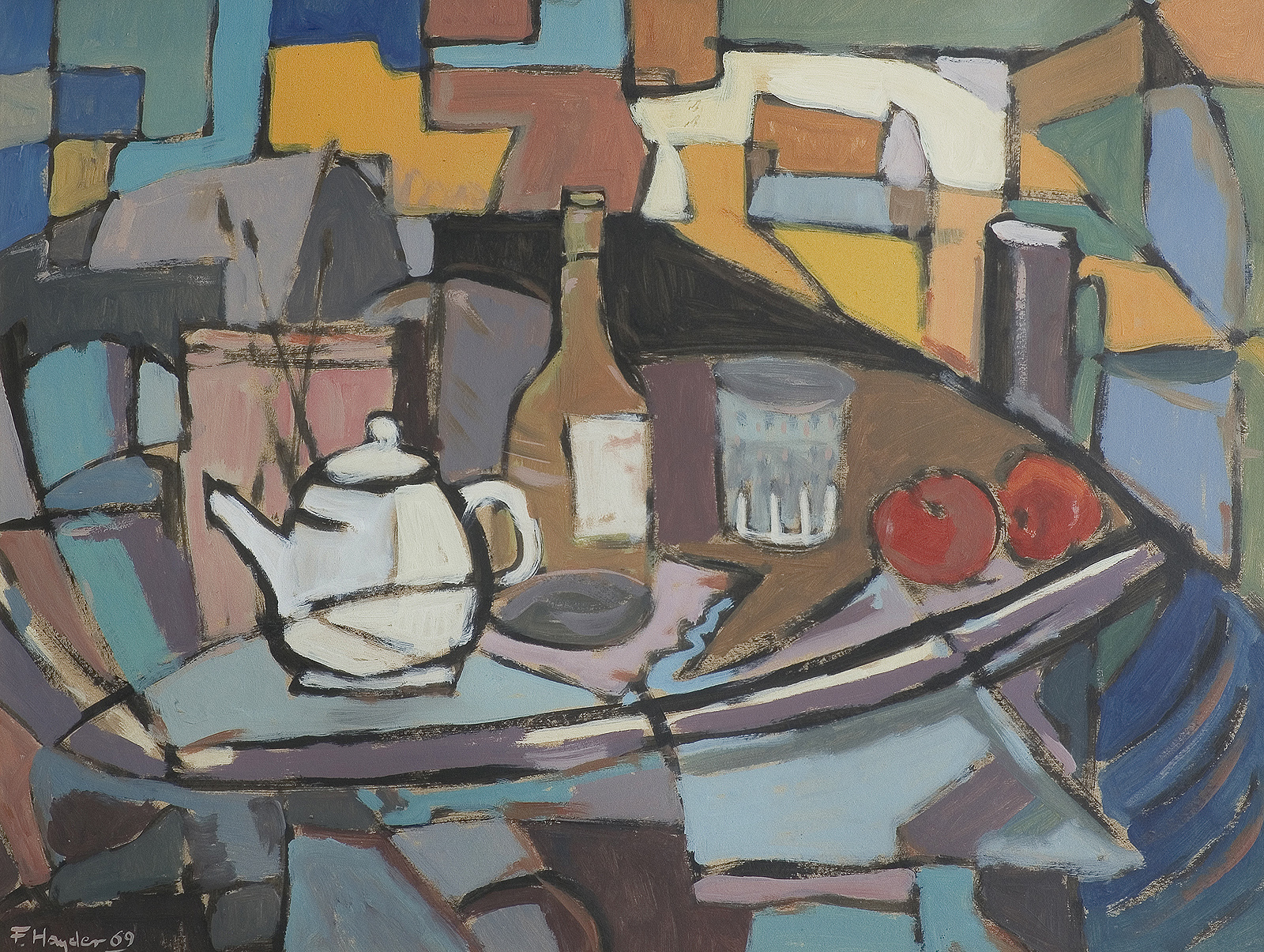 Fryderyk Antoni Hayder (Przemyśl 25 IV 1905 - Gliwice 1994) malarz, grafik; w latach 1925-1933 studiował w ASP w Krakowie - malarstwo w pracowni Józefa Mehoffera, rzeźbę u Xawerego Dunikowskiego, otrzymując dyplom z wyróżnieniem. Od 1935 zamieszkał w Warszawie. Obok malarstwa zajmował się grafiką użytkową i aranżacją wnętrz. Przed wojną brał udział w wystawach m.in. w Zachęcie (1937) i w TPSP w Krakowie (1938). Podczas Powstania Warszawskiego większa część prac uległa zniszczeniu. W 1945 artysta zamieszkał w Gliwicach, uratowane rysunki i szkicowniki z lat 1926-1944, przekazał do Muzeum w Gliwicach, gdzie po wojnie pracował jako kustosz. Współtworzył Gliwicki Oddział ZPAP, uczestniczył w wielu wystawach ogólnopolskich (Wystawa Plastyki Ziem Nadodrzańskich, W-wa 1959; Malarstwo w XV-lecie PRL, W-wa 1961). Miał szereg wystaw indywidualnych. m.in. 1957 CBWA Katowice, Szczecin; w 1984 z okazji 50-lecia pracy twórczej w Muzeum Okręgowym w Przemyślu; 1985 BWA Katowice, 1987 Zachęta Warszawa. Malował kompozycje figuralne, pejzaże, sceny rodzajowe i martwe natury. Po wojnie podejmował tematykę zaangażowana ideologicznie, od połowy lat 50. większą uwagę poświęcił stronie formalnej, malując w konwencji postkubistycznej. Obraz budował za pomocą linearnej siatki grubych konturów, kolor wyważony, rzadko o intensywnym natężeniu kładziony był płasko. Na początku lat 60. malował szereg abstrakcji o charakterze informelowskich, gdzie konstrukcja obrazu uległa zmiękczeniu, by w latach 70. powrócić do konturu wyznaczającego układ form i przestrzeń. Dążył do syntezy, malował dużymi płaszczyznami, upraszczał rysunek. Podejmował tematykę religijną, cykl „Droga Krzyżowa” znajduje się w Muzeum Narodowym Ziemi Przemyskiej w Przemyślu, jego prace są m.in. w zbiorach Muzeum Górnośląskiego w Bytomiu i w Muzeum w Gliwicach.