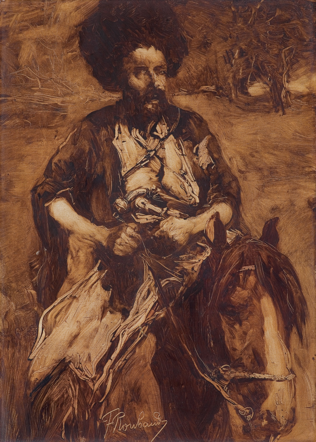 Franz Roubaud był z pochodzenia Francuzem, synem emigrantów osiadłych w Odessie. W latach 1877 -1878 studiował w Monachium - początkowo w Akademii u K. Piloty'ego, O. Seitza i W. Dieza, a następnie w prywatnej szkole Józefa Brandta. Malował obrazy batalistyczne oraz orientalne sceny rodzajowe z Kaukazu i Taszkientu z motywami koni, jeźdźców, Czerkiesów i Kozaków. Był autorem panoram Zdobycie górskiej twierdzy Achulgo na Kaukazie w 1859 r., Oblężenie Sewastopola w r.1854/1855 i najsławniejszej Panoramy bitwy pod Borodino, malowanej w 1912 r. w stulecie bitwy, a obecnie stale eksponowanej w Moskwie.