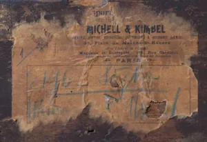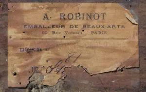 – na l. listwie ramy francuska nalepka transportowa, obok fragment kolejnej nalepki firmy transportowej [?]