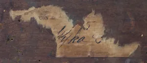 – l.g. fragment nalepki z napisem (tuszem): [...] | [fem]me en le che[val], poniżej (farbą): J. Roma