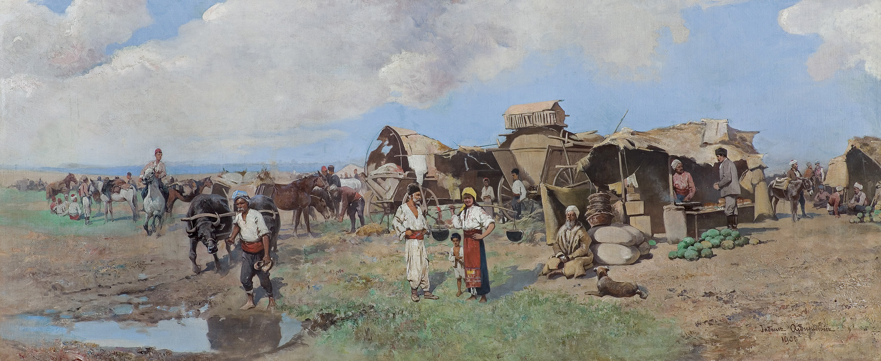 Tadeusz Ajdukiewicz (Bochnia 1851 - Kraków 1916) był artystą związanym z mecenatem arystokracji i dworów panujących; w tych kręgach zrobił prawdziwą karierę, a jego obrazy podobały się powszechnie. Studia malarskie rozpoczął w krakowskiej Szkole Sztuk Pięknych. Później kształcił się jeszcze w Wiedniu oraz w Monachium - w Akademii i w pracowni Józefa Brandta. Po studiach przez kilka lat jeździł po polskich dworach kresowych i malował portrety. Około 1877 wyjechał do Paryża, skąd, wraz z Władysławem Branickim wyjechał w – ważną dla jego przyszłej twórczości – podróż na Bliski Wschód. Około roku 1882 zamieszkał w Wiedniu, zajął pracownię po Hansie Makarcie (zm. 1884), malując dla dworu cesarskiego i arystokracji. W 1893 bawił w Londynie, gdzie, m.in. portretował księcia Walii, w 1894 pracował na dworze sułtańskim w Konstantynopolu, następnie także w Sofii, Petersburgu i Bukareszcie. W Rumunii osiadł na dłużej jako malarz nadworny Karola I. Po wybuchu I wojny światowej powrócił do kraju i, mimo starszego wieku, zaciągnął się do Legionów. Zmarł, nie wytrzymawszy trudów wojennych. Malował przede wszystkim portrety - zarówno reprezentacyjne, efektowne i eleganckie (Portret Heleny Modrzejewskiej, MNK), jak również skromne i kameralne. Tworzył też sceny myśliwskie, obrazy o tematyce wschodniej, bohaterskie sceny bitewne, rewie i przeglądy wojsk (Przegląd armii rumuńskiej, 1896).