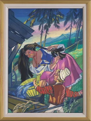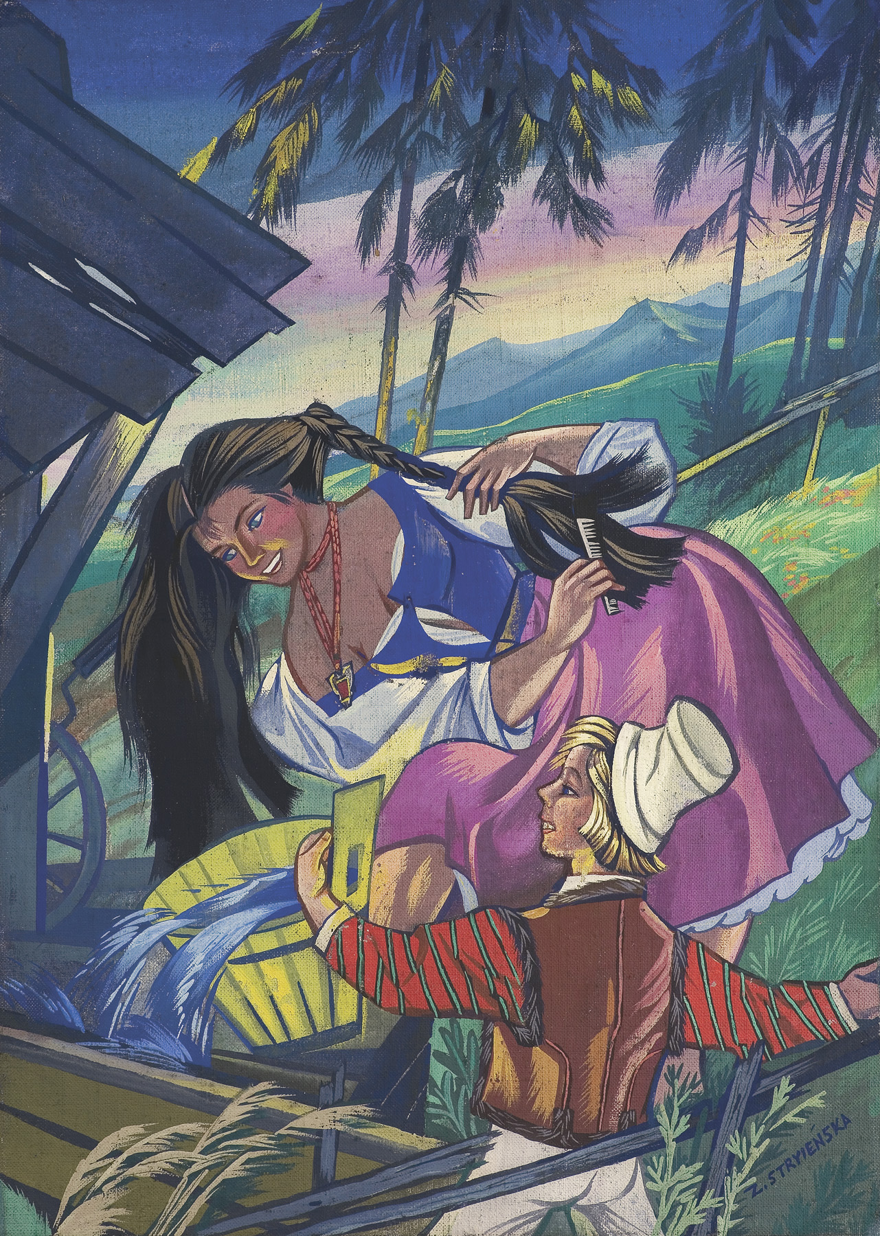 Zofia Stryjeńska, z domu Lubańska (Kraków 1891 - Genewa 1976) - malarka, ilustratorka, scenograf - była jedną z barwniejszych postaci polskiego środowiska artystycznego w dwudziestoleciu międzywojennym. Po krótkim okresie nauki u Leonarda Stroynowskiego i w krakowskiej szkole Marii Niedzielskiej wyjechała do Monachium, gdzie w latach 1911-1912 w męskim przebraniu studiowała w Akademii Sztuk Pięknych (kobiet wówczas na studia nie przyjmowano). Debiutowała w krakowskim TPSP w roku 1912 cyklem kartonów Polskich bajd inspirowanych opowieściami ludowymi. W 1916 wyszła za mąż za Karola Stryjeńskiego. Do 1919 mieszkała w Krakowie, później w Paryżu, Krakowie, Zakopanem i Warszawie. W roku 1925 odniosła międzynarodowy sukces na Wystawie Sztuki Dekoracyjnej w Paryżu, otrzymując Gran Prix w czterech działach (malarstwo, plakat, tkanina, ilustracja) oraz Diplom d’Honneur za projekty zabawek. Zajmowała się dekoracyjnym malarstwem architektonicznym, polichromią, ilustratorstwem, scenografią (m.in. Harnasie Karola Szymanowskiego; 1938), wzornictwem przemysłowym (projekty kilimów, zabawek). Stworzyła własny specyficzny styl w dekoracyjnie stylizowanych, barwnych, pełnych dynamiki i temperamentu obrazach; temperach, akwarelach i gwaszach. W ich tematyce odwoływała się do legend, wierzeń, historii i obyczajowości ludowej. Wydała kilka tek graficznych (Bożki słowiańskie, 1917 i 1922) i albumów reprodukcji (Tańce polskie, 1927; Pascha, 1929; Piastowie, 1929; Gusła Słowian / Magie Slave, 1934). Jej prace popularyzowane były także przez liczne barwne pocztówki.
