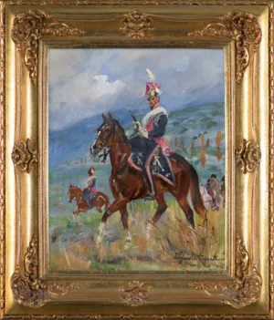 Wojciech Kossak (Paryż 1856 - Kraków 1942 ) – powszechnie znany malarz, postrzegany przede wszystkim jako świetny batalista. Syn i uczeń Juliusza Kossaka kształcił się w krakowskiej Szkole Sztuk Pięknych, w Akademii monachijskiej oraz w Paryżu. W latach 1895-1902 przebywał głównie w Berlinie, pracując dla cesarza Wilhelma II. Wiele podróżował, m.in. do Hiszpanii i Egiptu, gdzie wykonywał szkice do zamierzonych panoram. W późniejszych latach kilkakrotnie wyjeżdżał do Stanów Zjednoczonych wykonując zamówienia portretowe. W 1913 był mianowany profesorem warszawskiej Szkoły Sztuk Pięknych. W latach I wojny światowej pełnił służbę wojskową. Był współautorem panoram: „Racławice” (1893-1894), „Berezyna” (1895-1896), „Bitwa pod piramidami” (1901) oraz szkiców do niezrealizowanej „Somosierry” (1900). Z temperamentem i swobodą tworzył szeroko malowane, dynamiczne sceny batalistyczne, historyczne, rodzajowe oraz liczne portrety. Z upodobaniem malował konie. Jego obrazy, gloryfikujące dawne i współczesne artyście polskie wojsko i bohaterstwo żołnierzy, trafiały do patriotycznych uczuć odbiorców i cieszyły się ogromna popularnością.