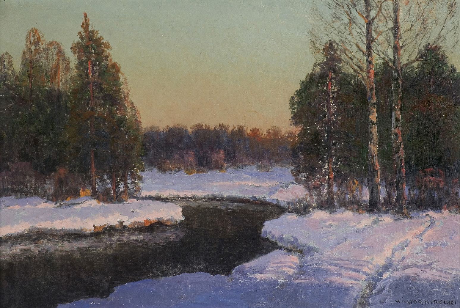 Wiktor Korecki (Kamieniec Podolski 1890 - Komorów k. Warszawy 1980) - malarz pejzażysta - gimnazjum ukończył w Kijowie, tam też studiował w Szkole Rysunkowej Aleksandra Muraszki. Po studiach wrócił do Kamieńca Podolskiego, skąd w roku 1921 wyjechał do Warszawy. Tu miał pracownię na rogu ulic Tamki i Cichej. Niestety zgromadzone tam obrazy spłonęły w czasie powstania 1944 roku. Po powstaniu artysta przebywał w obozie w Pruszkowie skąd trafił do obozu pracy w Lipsku. Do kraju powrócił w roku 1946 i zamieszkał w Komorowie pod Warszawą, a później w Milanówku. Jego nastrojowe krajobrazy emanujące spokojem i pogodą cieszyły się zawsze dużą popularnością. Korecki najczęściej malował pejzaże zimowe z motywem leśnej drogi i strumienia wijącego się wśród śniegów, a obok nich także wiosenne, letnie czy jesienne widoki z Mazowsza.
