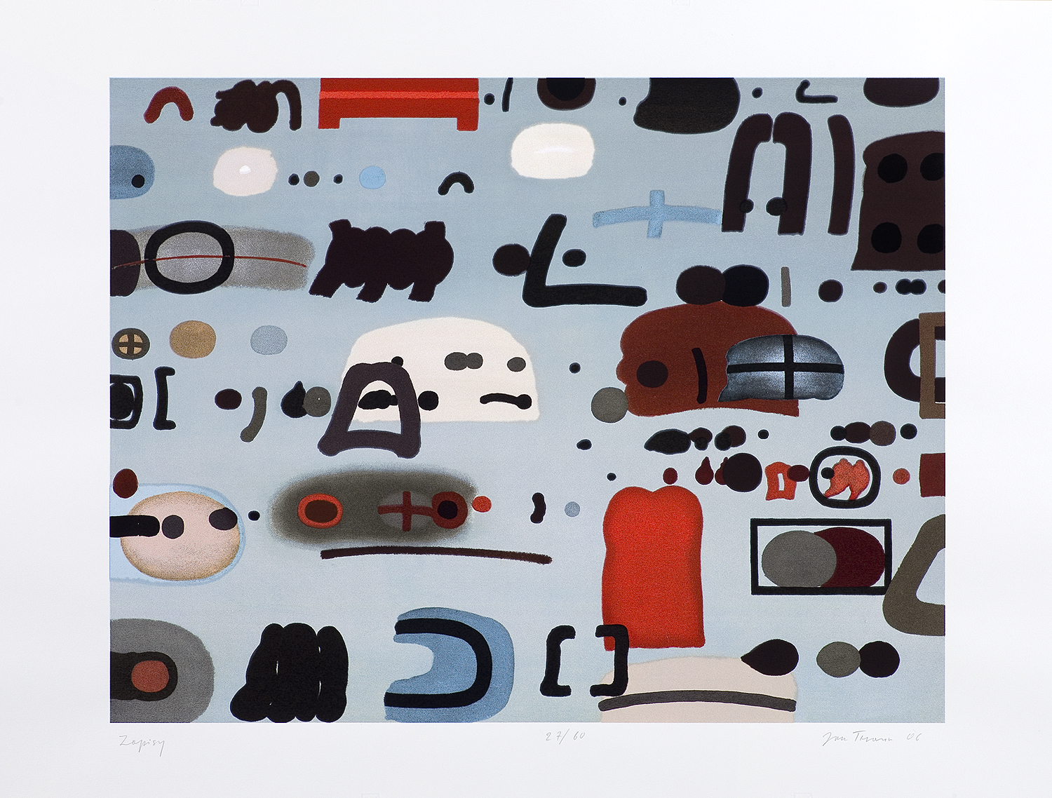 Jan Tarasin (Kalisz 11 IX 1926 - Warszawa 8 VIII 2009) studiował malarstwo w ASP w Krakowie pod kierunkiem prof. Zbigniewa Pronaszki (1946-1951). Jeszcze jako student zadebiutował na I Wystawie Sztuki Nowoczesnej w Krakowie w 1948/49. W połowie lat 50. stworzył cykle litografii: „Nowa Huta i jej mieszkańcy“, 1954, „Dom“, 1955). W pierwszym przeciwstawił się oficjalnemu optymizmowi, w drugim, operując symboliką martwej natury, zawarł treści egzystencjalne i odnoszące do niedawnego dramatu wojny. Po 1956 zaczął malować obrazy niefiguratywne. Układy wyodrębnionych elementów (określanych jako „przedmioty“) umieszczane były przez artystę na płaszczyźnie (cykl „Wnętrze“, 1957) ), lub w aluzyjnej przestrzeni (cykle „Uczta“, 1957, „Brzeg“, 1962-1964, „Przedmioty policzone“, od 1968, „Antykwariat“, 1968). Zasada ta utrzymuje się w jego malarstwie w następnych latach, różnice między okresami twórczości dotyczą sposobu opracowania „przedmiotów“ i ich usytuowania w przestrzeni obrazu lub wobec tła. Od lat 70. „przedmioty“ zmieniają się w graficzne, zwykle czarne znaki na jasnych tłach (cykl „Kolekcja“, od 1971). Tła z kolei bywają iluzyjnie przestrzenne, zróżnicowane walorowo, miękkie. W latach 90. artysta wrócił do kolorystycznego, bardziej malarskiego rozwiązywania zarówno znaków, jak i teł, często ciemnych lub przenikających się z „przedmiotami“ (cykl „Wylęgarnia przedmiotów“, 1992). Tarasin od 1962 jest członkiem „Grupy Krakowskiej“. W 1963-67 uczył na Wydziale Architektury Wnętrz krakowskiej ASP. W 1967 przeniósł się do Warszawy, w 1974 podjął pracę pedagogiczną na Wydziale Malarstwa ASP w Warszawie. W 1987-90 był rektorem tej uczelni. W 1976 otrzymał Nagrodę Krytyki Artystycznej im. Cypriana Kamila Norwida, w 1984 Nagrodę im. Jana Cybisa.; Nagroda na MB Sztuki w San Marino 1965. Równolegle z malarstwem zajmował się rysunkiem i grafiką - do lat 60. litografią, od 1974 serigrafią. W 1974-1981 wydał 8 autorskich „Zeszytów“ z serigrafiami i własnymi tekstami. W 1995 w Galerii Zachęta odbyła się wystawa artysty, której towarzyszył monograficzny katalog.