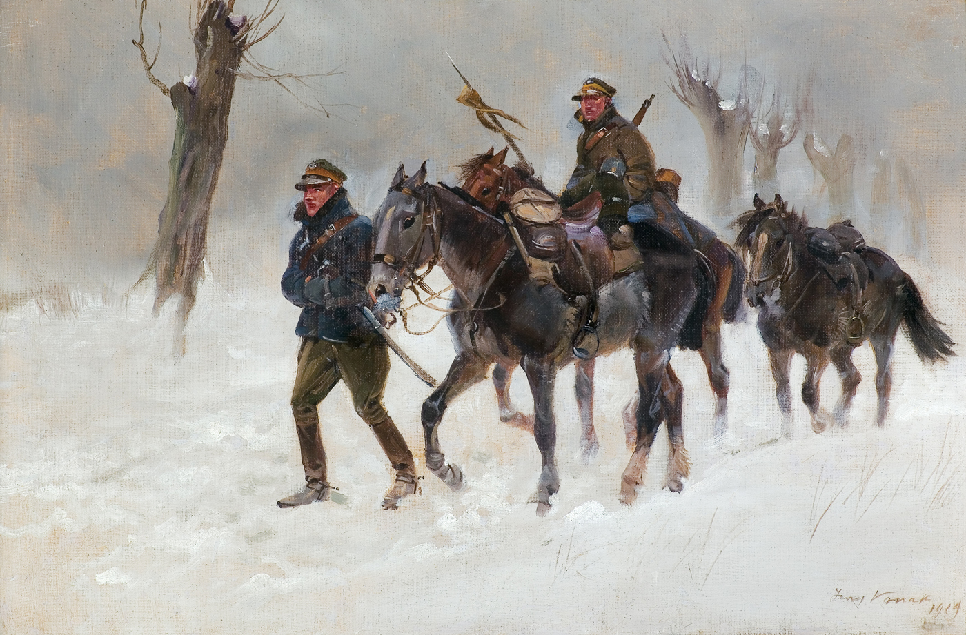 Jerzy Kossak (Kraków 1886 - Kraków 1955)- syn Wojciecha, wnuk Juliusza Kossaków - od wczesnego dzieciństwa malował pod kierunkiem ojca i dziadka. Kontynuator i naśladowca ich sztuki tworzył sceny batalistyczne, historyczne i rodzajowe z wszechobecnym motywem konia. Malował obrazy z powstania listopadowego, wojen napoleońskich oraz wiele scen z wojny 1920 roku. Najbardziej znaną jego kompozycją tego rodzaju był Cud nad Wisłą. Malował też liczne Pogonie i Pościgi ułanów za kozakami, Napady wilków, Polowania i Wesela. Tematyka tych prac sprawia, że stale cieszą się zainteresowaniem zbieraczy i publiczności, zawsze tłumnie odwiedzającej wystawy malarstwa Kossaków.