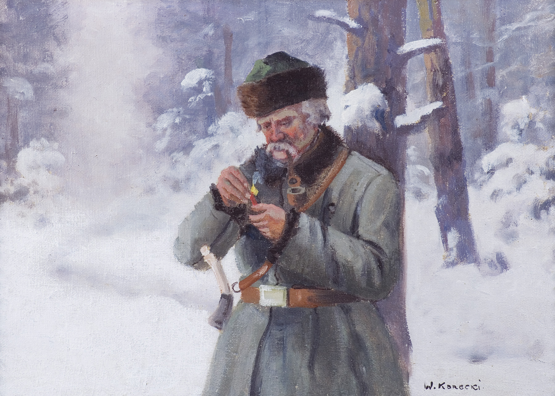 Wiktor Korecki (Kamieniec Podolski 1890 - Komorów k. Warszawy 1980) - malarz pejzażysta - gimnazjum ukończył w Kijowie, tam też studiował w Szkole Rysunkowej Aleksandra Muraszki. Po studiach wrócił do Kamieńca Podolskiego, skąd w roku 1921 wyjechał do Warszawy. Tu miał pracownię na rogu ulic Tamki i Cichej. Niestety zgromadzone tam obrazy spłonęły w czasie powstania 1944 roku. Po powstaniu artysta przebywał w obozie w Pruszkowie skąd trafił do obozu pracy w Lipsku. Do kraju powrócił w roku 1946 i zamieszkał w Komorowie pod Warszawą, a później w Milanówku. Jego nastrojowe krajobrazy emanujące spokojem i pogodą cieszyły się zawsze dużą popularnością. Korecki najczęściej malował pejzaże zimowe z motywem leśnej drogi i strumienia wijącego się wśród śniegów, a obok nich także wiosenne, letnie czy jesienne widoki z Mazowsza.