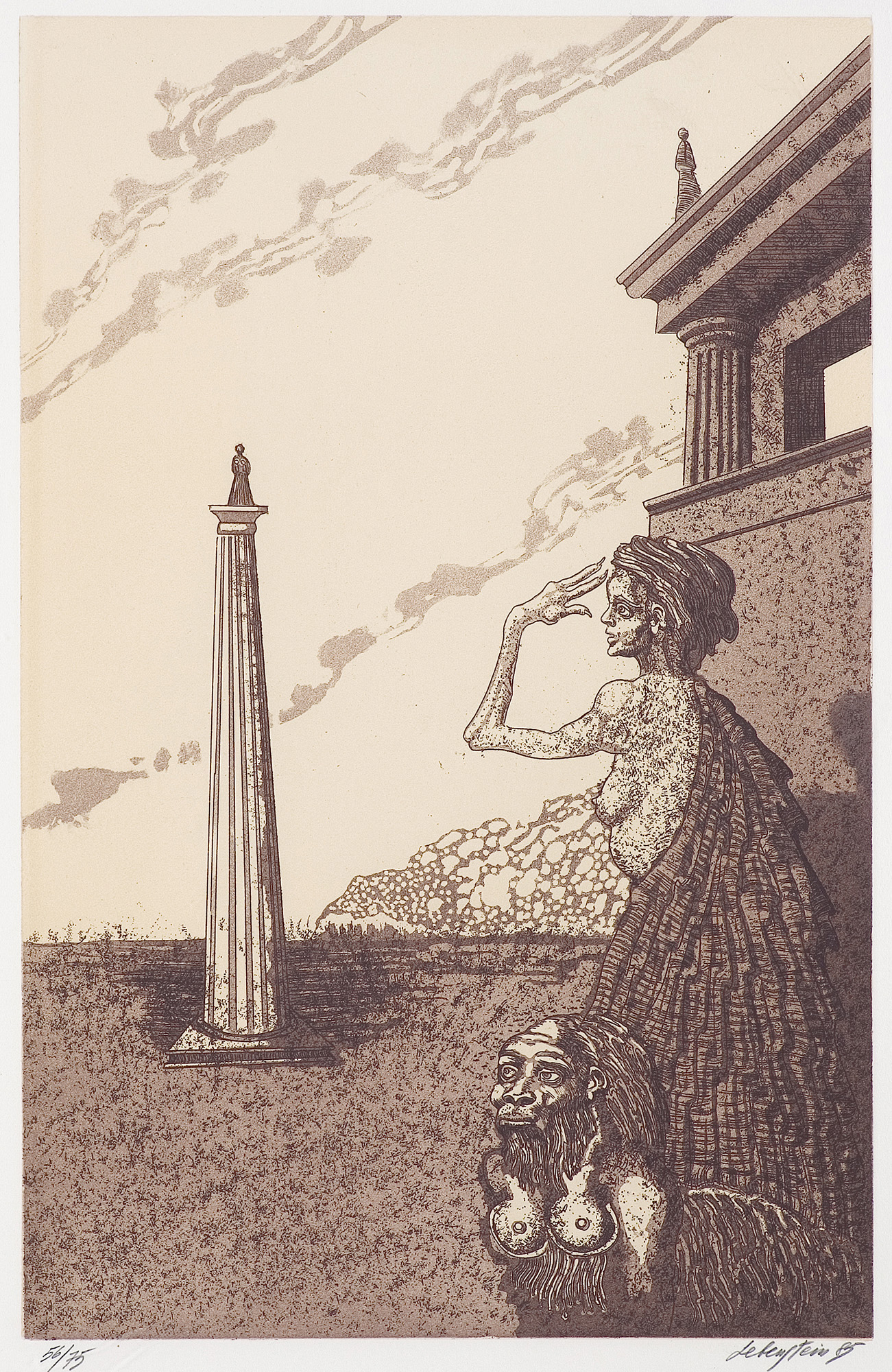 Jan Lebenstein (Brześć Litewski 1930 - Kraków 1999) w latach 1948-1954 studiował malarstwo w ASP w Warszawie pod kierunkiem prof. Eugeniusza Eibischa i Artura Nachta-Samborskiego. W 1955 wziął udział w wystawie w warszawskim Arsenale. Zaprzyjaźniony w czasie studiów z Mironem Białoszewskim, swą pierwszą wystawę indywidualną pokazał w 1956 w Teatrze na Tarczyńskiej. W 1959 zdobył Grand Prix de la Ville de Paris na I Biennale Młodych w Paryżu i w tym roku przeniósł się na stałe do Paryża. Po seriach "figur kreślonych" (na papierze milimetrowym) i "figur hieratycznych" z lat 1955-1958 maluje cykl "figur osiowych" (1958-1962), które wystawia w Paryżu i USA. Równolegle w 1960 zaczyna rysowane "karnety", rodzaj dziennika, który w przyszłości dostarczy motywów wykorzystanych w obrazach. W latach 1964-1965 maluje "Bestiarium", cykl fakturowych, archaizowanych stworów przypominających prehistoryczne wykopaliska. Bezpośrednio po nich wprowadza do swych obrazów postaci ludzkie i fantastyczne, odgrywające sceny ni to mitologiczne, ni to ze snu, często przesycone erotyką. W 1970 projektuje witraże dla Centre du Dialogue w Paryżu. W W 1971 otrzymuje obywatelstwo francuskie 1974 powstają gwasze inspirowane Folwarkiem zwierzęcym George'a Orwella. W latach 1976-1989 tworzy wyłącznie w technice gwaszu i pastelu, podejmując tematykę mitologiczną i zaczerpniętą z Biblii: cykle ilustracji do Księgi Hioba (wyd. 1979) i do Apokalipsy (wyd. 1986) w nowych przekładach Czesława Miłosza. W 1989 powraca do malarstwa olejnego (cykl "Pergamon"). Artysta otrzymał m. in. nagrodę Fundacji im. Alfreda Jurzykowskiego w 1976, Nagrodę Muzeum Archidiecezji Warszawskiej w 1985, Nagrodę im. Jana Cybisa w 1987.