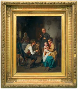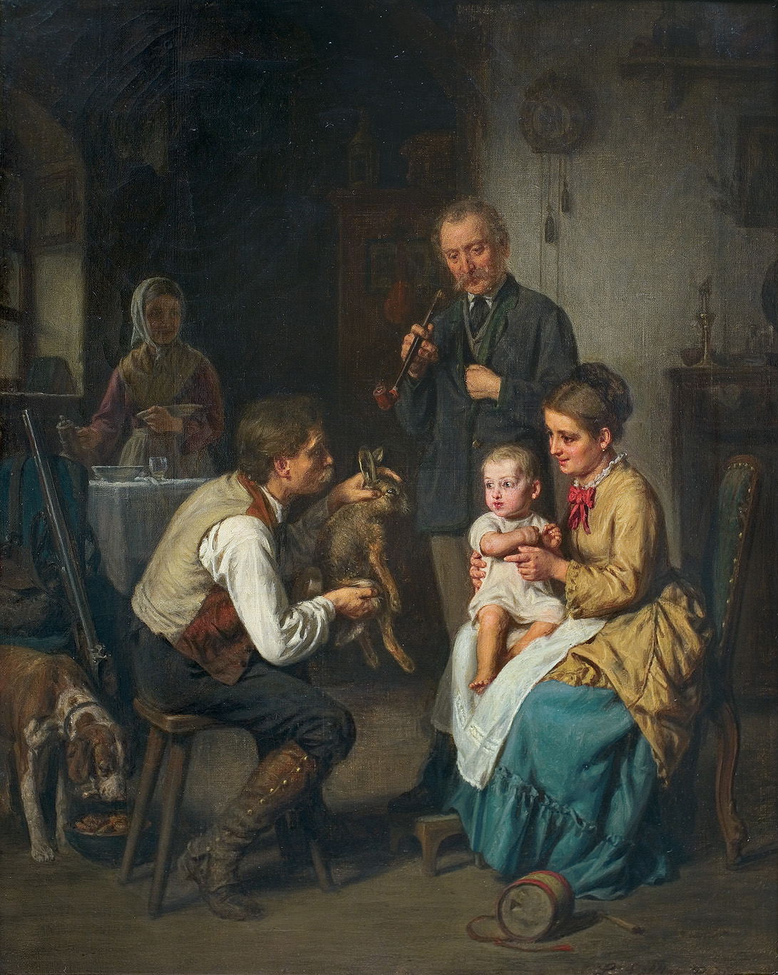 Leopold Löffler (Loeffler) - malarz scen rodzajowych i rodzajowo-historycznych; pierwotnie studiował na wydziale filozoficznym Uniwersytetu we Lwowie. Jednocześnie uczył się malarstwa, które następnie studiował w Akademii wiedeńskiej u Ferdinanda Georga Waldmüllera (1845-1846), później w Paryżu (od 1851 lub 1852) i w Monachium (1856). Na stałe zamieszkał w Wiedniu, gdzie cieszył się uznaniem i został mianowany członkiem tamtejszej Akademii Sztuk Pięknych. Związany ze środowiskiem polskich malarzy kształcących się w wiedeńskiej Akademii, przyjaźnił się, m.in. z Arturem Grottgerem, Franciszkiem Tepą i Juliuszem Kossakiem. Często przyjeżdżał do kraju - do Lwowa, Radymna i do Krakowa, dokąd z czasem przeniósł się na stałe. W latach 1877-1897 był profesorem krakowskiej Szkoły Sztuk Pięknych; do grona jego uczniów należeli, m.in. Zdzisław Jasiński, Wojciech Weiss, Wincenty Wodzinowski, Stanisław Wyspiański. Malował obrazy historyczno-rodzajowe (Śmierć Stefana Czarnieckiego, 1860, Powrót rodziny szlacheckiej na gruzy rodzinnego domu po napadzie Tatarów, 1858), portrety oraz rodzajowe scenki mieszczańskie i wiejskie, powstające pod wyraźnym wpływem malarstwa Waldmüllera. Czytelna anegdota i sentymentalny wdzięk, doskonały rysunek i niezwykła precyzja w oddawaniu szczegółów przyniosły tym pracom ogromną popularność w kraju, w Austrii i na Węgrzech. Powodzenie sprawiło, że artysta - czasem nawet wielokrotnie - powtarzał te same kompozycje w licznych replikach. Jego obrazy pokazywane były na różnych wystawach; przede wszystkim w wiedeńskim Künstlerhaus, ale także w Berlinie, Monachium, Paryżu, Kolonii, Pradze oraz w Krakowie, Warszawie, Pownaniu i we Lwowie. Kupowano je do zbiorów cesarza, arystokracji, do licznych kolekcji niemieckich i prywatnych. Powielane w reprodukcjach „rozchodziły się po całej monarchii“. Dla podkreślenia swojej narodowości od roku 1867 artysta często dodawał przy sygnaturze słowo „Radymno“, nazwę miejscowości gdzie spędził dzieciństwo.