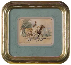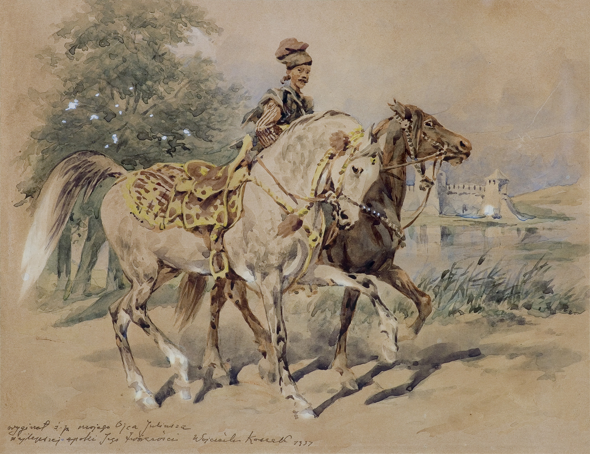 Juliusz Kossak (Wiśnicz 1824 - Kraków 1899) - malarz i ilustrator - był jednym z najpopularniejszych artystów polskich 2. połowy XIX wieku. Naukę rysunku i malarstwa rozpoczął we lwowskiej pracowni Jana Maszkowskiego; później wiele rysował z natury odwiedzając majątki szlacheckie na Ukrainie, Podolu i Wołyniu. W roku 1852 był w Wiedniu, na Węgrzech i w Petersburgu, a następnie zamieszkał na stałe w Warszawie. Lata 1856-1860 spędził w Paryżu, gdzie przyjaźnił się z Horacem Vernetem. Powróciwszy do Warszawy w latach 1862-1868 był kierownikiem artystycznym „Tygodnika Ilustrowanego”. W roku 1869 przeniósł się na stałe do Krakowa, skąd wyjeżdżał jeszcze do Monachium, by malować w atelier batalisty Franza Adama. Kossak był przede wszystkim znakomitym akwarelistą; rzadziej posługiwał się techniką olejną. Malował obrazy historyczne i batalistyczne, sceny rodzajowe ilustrujące życie i tradycje dworu szlacheckiego oraz obyczaje polskiego ludu. Ale prawdziwymi bohaterami jego obrazów były konie, których ruch, temperament, charakter i indywidualność potrafił po mistrzowsku przedstawić. Był także autorem wielu ilustracji do czasopism i książek, trafiającym bezbłędnie tak w klimat utworów literackich, jak i w tęsknoty i potrzeby odbiorców - czytelników Pieśni o ziemi naszej Wincentego Pola, Trylogii Henryka Sienkiewicza, Pana Tadeusza i poematów Adama Mickiewicza.