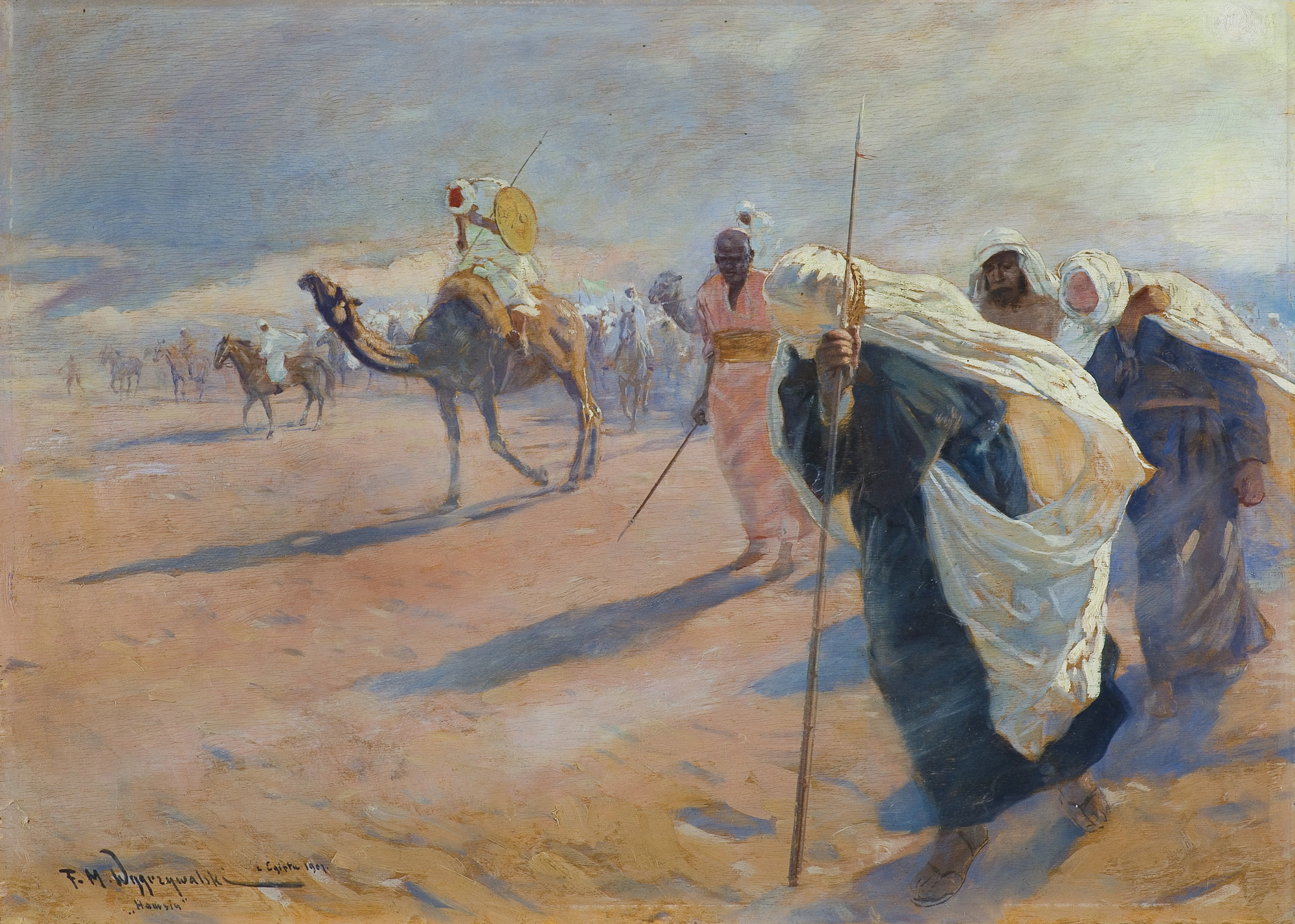 Feliks Michał Wygrzywalski (Przemyśl 1875 - okolice Rzeszowa 1944) w latach 1893-98 studiował w ASP w Monachium pod kierunkiem J.C.Hertericha i K.Marra. Studia uzupełniał w Académie Julian w Paryżu. Już w czasie studiów wyjeżdżał do Włoch, a po 1900 przez kilka lat mieszkał w Rzymie. W 1906 podróżował do Egiptu. W 1908 na stałe osiadł we Lwowie. W latach 1909-14 pracował w tamtejszym teatrze jako inspektor sceny. Jeszcze kilkakrotnie podróżował do Włoch. Był malarzem realistą; we wcześniejszym okresie twórczości skłaniał się ku naturalizmowi i silnej ekspresji. Dużą wagę przywiązywał do efektów świetlnych, stosował bogatą, żywą gamę barwną. We wczesnych obrazach często przedstawiał ludzką pracę (Burłacy) lub dramatyczne wydarzenia i napięcia społeczne (Strajk, Chleba nam głodnym). Malował też portrety, akty, pejzaże nadmorskie, krajobrazy z Włoch i Ukrainy. Po podróży do Egiptu w jego malarstwie powtarzały się motywy i tematy orientalne (Modlitwa Arabów, Sprzedawcy dywanów). Zajmował się dekoracyjnym malarstwem ściennym, m.in. w 1908 zaprojektował, a później wykonał alegoryczne malowidła do gmachu Izby Handlowo-Przemysłowej we Lwowie. Zajmował się grafiką, ilustrował książki i czasopisma, projektował witraże, kostiumy i dekoracje teatralne (m.in. do Peer Gynta, Irydiona, Nocy listopadowej).