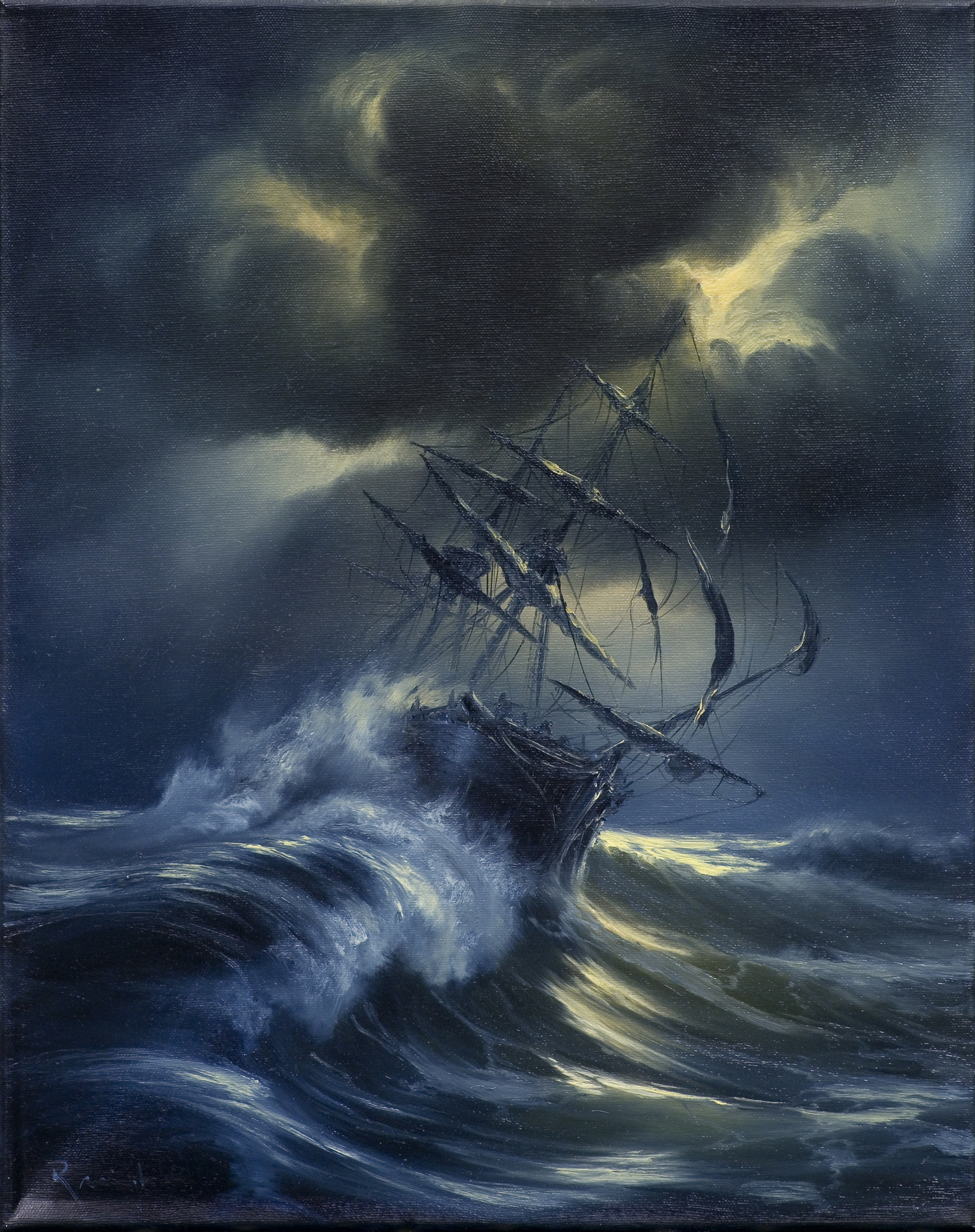 Artysta natchniony pięknem morza i obrazami statków walczących z silnymi falami, często na tle dramatycznego nieba, kontynuuje tradycje malarstwa marynistycznego z okresu epoki romantyzmu.