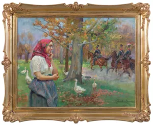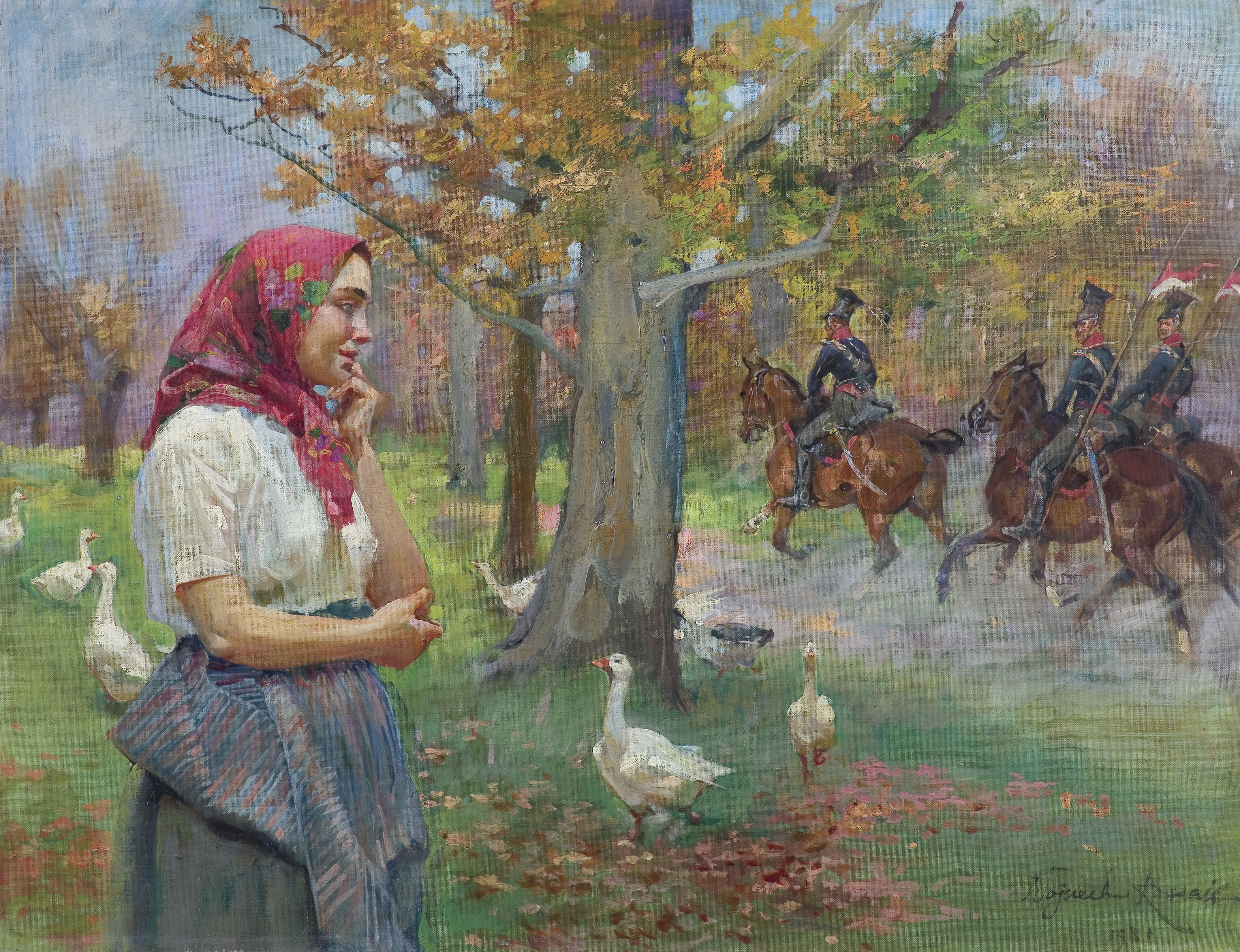 Wojciech Kossak (Paryż 1856 - Kraków 1942 ) – powszechnie znany malarz, postrzegany przede wszystkim jako świetny batalista. Syn i uczeń Juliusza Kossaka kształcił się w krakowskiej Szkole Sztuk Pięknych, w Akademii monachijskiej oraz w Paryżu. W latach 1895-1902 przebywał głównie w Berlinie, pracując dla cesarza Wilhelma II. Wiele podróżował, m.in. do Hiszpanii i Egiptu, gdzie wykonywał szkice do zamierzonych panoram. W późniejszych latach kilkakrotnie wyjeżdżał do Stanów Zjednoczonych wykonując zamówienia portretowe. W 1913 był mianowany profesorem warszawskiej Szkoły Sztuk Pięknych. W latach I wojny światowej pełnił służbę wojskową. Był współautorem panoram: „Racławice” (1893-1894), „Berezyna” (1895-1896), „Bitwa pod piramidami” (1901) oraz szkiców do niezrealizowanej „Somosierry” (1900). Z temperamentem i swobodą tworzył szeroko malowane, dynamiczne sceny batalistyczne, historyczne, rodzajowe oraz liczne portrety. Z upodobaniem malował konie. Jego obrazy, gloryfikujące dawne i współczesne artyście polskie wojsko i bohaterstwo żołnierzy, trafiały do patriotycznych uczuć odbiorców i cieszyły się ogromna popularnością.
