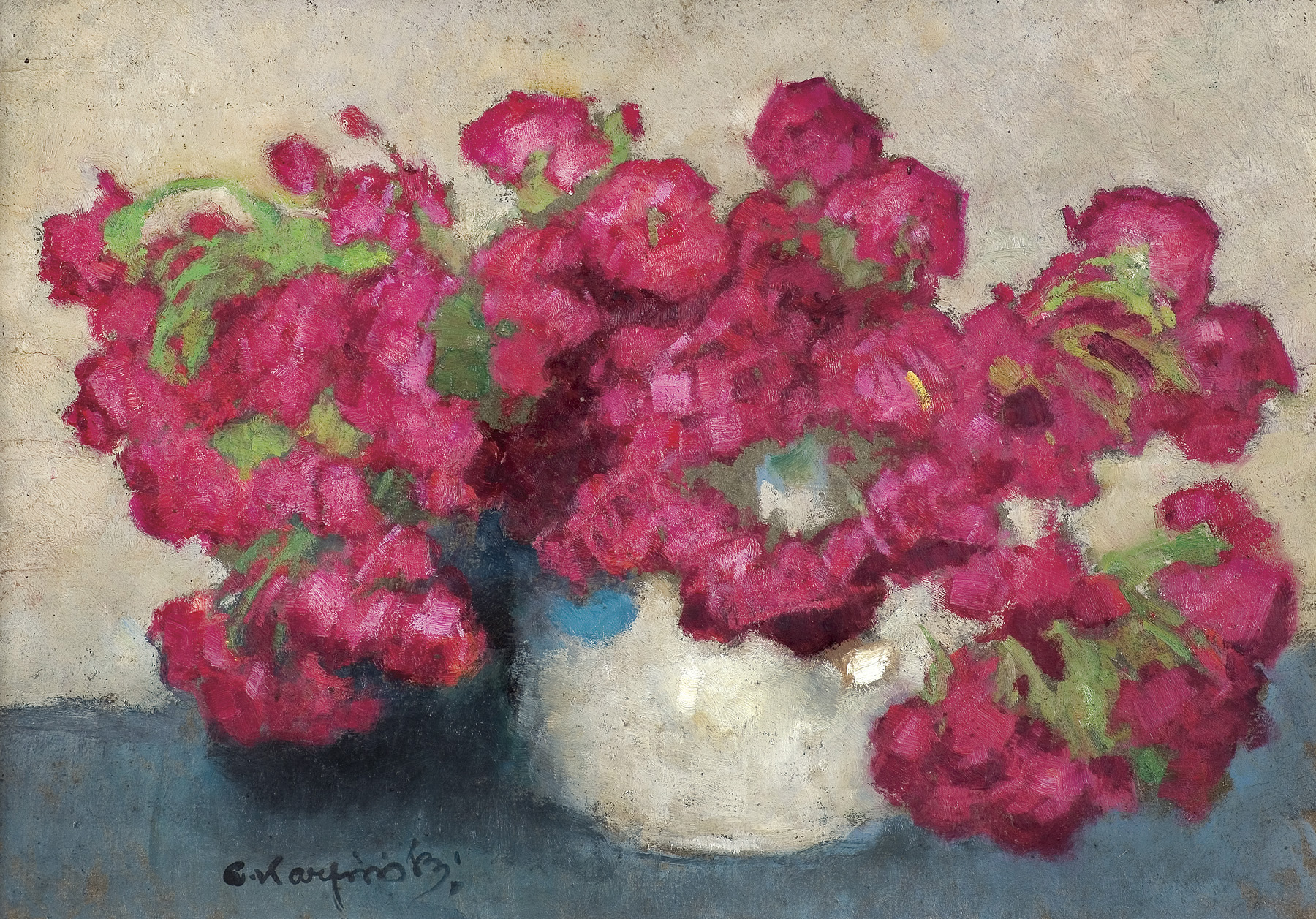 Alfons Karpiński (Rozwadów, dziś dzielnica Stalowej Woli 1875 - Kraków 1961) w latach 1891-1899 studiował w krakowskiej Szkole Sztuk Pięknych pod kierunkiem Floriana Cynka, Izydora Jabłońskiego, Władysława Łuszczkiewicza i Leona Wyczółkowskiego, a następnie kształcił się jeszcze u Antona Ažbégo w Monachium (1903), u Kazimierza Pochwalskiego w Wiedniu, a od 1907 także w Paryżu. Podróżował do Włoch i Londynu. Stale mieszkał w Krakowie; związany z tamtejszym środowiskiem skupionym wokół „Zielonego Balonika” projektował dekoracje do przedstawień kabaretu. Należał do Tow. Artystów Polskich „Sztuka”, grupy „Zero”, był członkiem wiedeńskiego stowarzyszenia „Secesja” i krakowskiego TPSP. Uczestniczył w wielu wystawach w kraju i za granicą. W czasie I wojny światowej służył w armii austriackiej. Na bogatą twórczość artysty składają się wczesne sceny rodzajowe z podkrakowskiej wsi, pejzaże i portrety, wśród nich zwłaszcza portrety kobiece, które przyniosły mu szczególną popularność. Z czasem głównym – obok portretu – tematem jego obrazów stały się martwe natury z kwiatami, dekoracyjne kompozycje o stonowanej gamie barwnej. Artysta zajmował się także grafiką i ilustratorstwem.