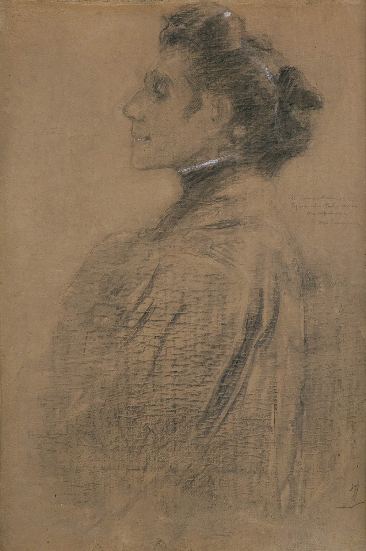 – poniżej wzdłuż lewej krawędzi nalepka (maszynopis): Ksawery Pusłowski, Kraków, ul.Westerplatte 10 | Olga Boznańska: Autoportret | rys. węglem na kartonie;