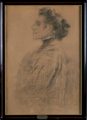 – obok nalepka z opisem (tuszem): Olga Boznańska | autoportret | Rysunek węglem.;
