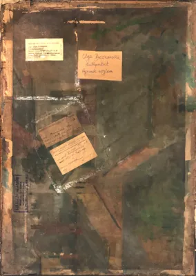 – obok nalepka MNK (druk, maszynopis): MUZEUM NARODOWE W KRAKOWIE | Autor Olga Boznańska | Tytuł Autoportret | Technika i wymiary rys. węgl., 71 x 50 | Właściciel Ksawery Pusłowski, Kraków | Wystawa O. Boznańska Nr kat. rys. 1 | r. 1960;