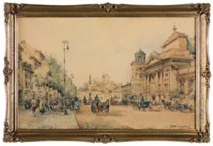 Władysław Chmieliński (Warszawa 1911 - Warszawa 1979) był malarzem związanym z Warszawą, gdzie stale mieszkał i pracował. W latach 1926-1931 studiował w warszawskiej Miejskiej Szkole Sztuk Zdobniczych i Malarstwa (dawna Klasa Rysunkowa). Wiodącym tematem jego obrazów były widoki miejskie, malowane olejno i akwarelą. W latach 1935-1938 stworzył cykl akwarel przedstawiających obiekty polskiej architektury; wśród nich, widoki Sandomierza, Krakowa, Kazimierza nad Wisłą, a także wnętrza zabytkowych kościołów czy pałaców, m.in. Zamku Królewskiego w Warszawie i Pałacu w Wilanowie. Malował także pejzaże i wiejskie sceny rodzajowe – kuligi, sanny, zaprzęgi, wesela, konie na tle krajobrazu. W latach 1967-1969 wyjeżdżał na dłuższe pobyty do Danii. W latach 1936-1939 artysta używał także pseudonimu „Władysław Stachowicz”.