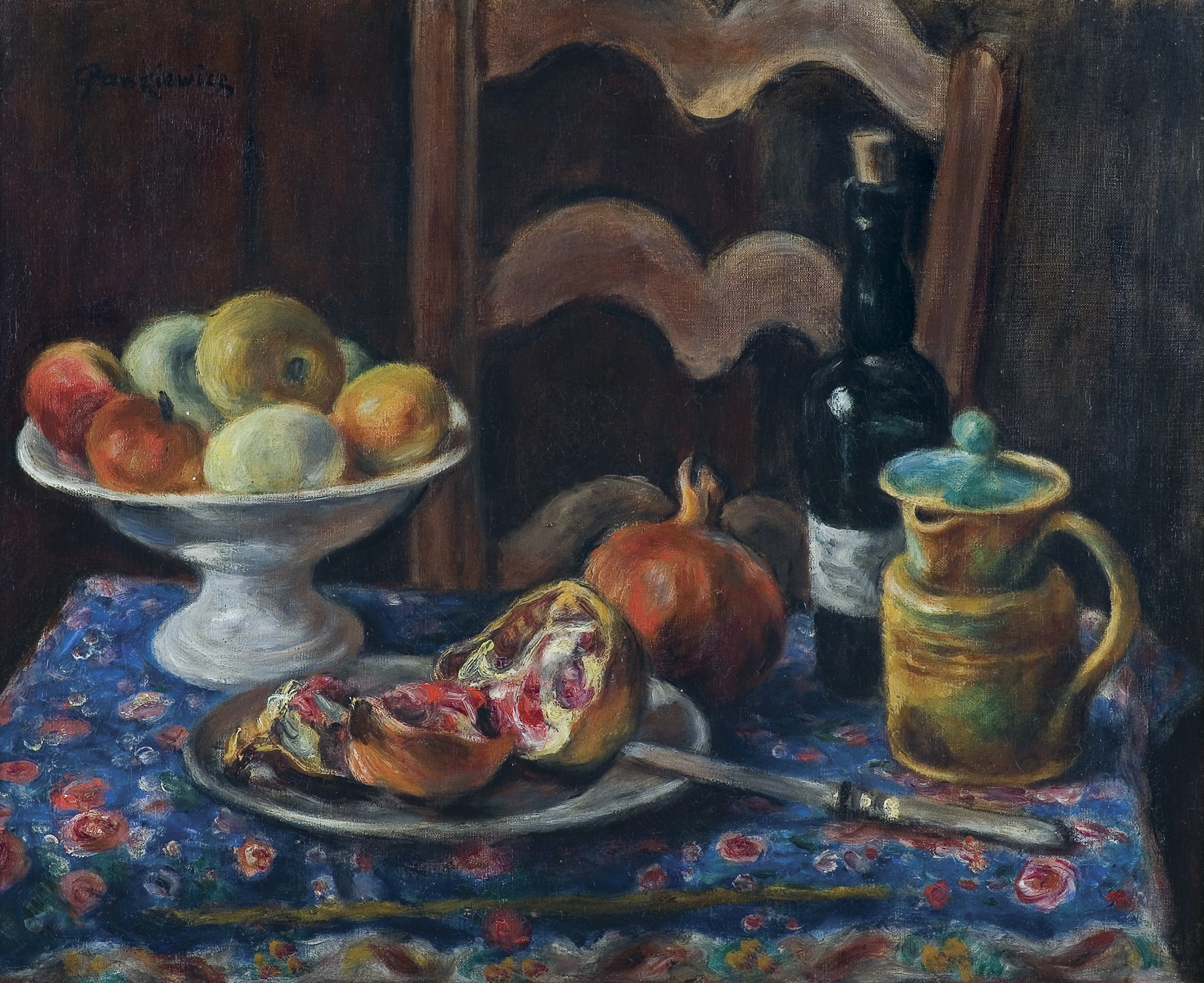 Józef Pankiewicz (Lublin 1866 – Marsylia 1940) malarz, grafik, pedagog; w latach 1884-1885 był uczniem Wojciecha Gersona i Aleksandra Kamińskiego w warszawskiej Klasie Rysunkowej. Następnie przez rok studiował w ASP w Petersburgu. Po powrocie mieszkał w Warszawie. Malował wówczas realistyczne sceny rodzajowe, wykonywał też ilustracje do warszawskich czasopism. W 1889 wraz z Władysławem Podkowińskim wyjechał do Paryża i tam uległ fascynacji impresjonizmem. U schyłku stulecia tworzył nokturny i kompozycje symboliczne. W latach następnych wiele podróżował po Europie malując martwe natury, pejzaże i portrety inspirowane sztuką japońską oraz malarstwem Renoira, Cezanne’e, Matisse’a. Lata 1914-1919 spędził w Hiszpanii. Od 1906 był profesorem krakowskiej ASP, a od 1925 kierował, powstałą pod jego protektoratem, paryską filią tej uczelni. Był nauczycielem wielu malarzy-kolorystów z tzw. grupy kapistów. W tym czasie stale mieszkał w Paryżu, a letnie miesiące spędzał na południu Francji. Zajmował się grafiką - jego prace należą do najwybitniejszych osiągnięć w tej dziedzinie sztuki polskiej. W roku 2006 w Muzeum Narodowym w Warszawie odbyła się wielka wystawa „Józef Pankiewicz. Życie i dzieło”, której towarzyszył obszerny katalog, będącym świetnie opracowaną, wyczerpującą monografią artysty i jego twórczości.