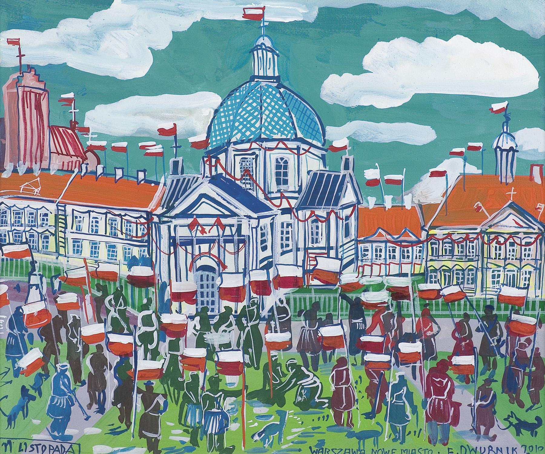 Edward Dwurnik (Radzymin 19 IV 1943 - Warszawa 28 X 2018) studiował malarstwo w ASP w Warszawie (1963-1970), jednak jako swego „mistrza“ wymienia Nikifora. Jego to prace, zobaczone po raz pierwszy w 1965, zainspirowały ówczesnego studenta III roku do narysowania pierwszych prac z cyklu „Podróże autostopem“, które kontynuował w nastepnych latach. W 1972-1978 powstawał cykl „Sportowcy“, w którym portretowane były, dodajmy - kąśliwie, typowe postaci z lat 70. Równolegle od 1975 powstawał cykl „Robotnicy“, który kulminował w okresie „Solidarności“ 1980-1981. Za prace z tego cyklu Dwurnik otrzymał w 1981 Nagrodę Krytyki Artystycznej im. Cypriana Kamila Norwida, natomiast za obrazy z cyklu „Warszawa“ (1981), proroczo zapowiadające stan wojenny - Nagrodę Kulturalną „Solidarności“ podziemnej w 1983. W latach 80. malarstwo Dwurnika przybrało wyraz ekspresyjny i dramatyczny. Powstające w tej dekadzie obrazy miały niejednokrotnie wymowę polityczną, przybierały też kostium historyczny, tak czy inaczej odnoszący się do współczesnych spraw i realiów. Cykl „Droga na Wschód“ (1989-91) upamiętniał ofiary stalinizmu, natomiast cykl „Od Grudnia do Czerwca“ (1990-94) - ofiary stanu wojennego. Zarówno ideowe, jak i czysto malarskie walory tych prac przyniosły artyście ogromne uznanie, zarówno w kraju jak i za granicą. Jego wyrazem była prestiżowa nagroda Fundacji Coutts & Co w Zurychu (1992). W latach 90. powstają cykle będące kontynuacją „Podróży autostopem“: „Niebieskie miasta“ (od 1993) i „Diagonale“ (od 1996), jak również kompozycje nowego typu, jak widoki morskie (cykl „Błękitne“, 1992-93) czy cykl „Wyliczanka“ (1996-99). Artysta wiele wystawia, miał ok. 100 wystaw indywidualnych w Polsce i za granicą, brał też udział w licznych wystawach i festiwalach krajowych i międzynarodowych, m.in.: X Biennale Sztuki Współczesnej, Menton 1974, Documenta 7, Kassel 1982, 5th Biennale, Sydney 1985, XIX Biennale Sztuki, Sao Paulo 1987; Olimpiada Sztuki, Seul 1988. Równolegle z malarstwem uprawiał rysunek, collage, grafikę warsztatową (litografia, techniki metalowe, kserografia, stemple) i użytkową (ilustracja, plakaty do własnych wystaw indywidualnych).