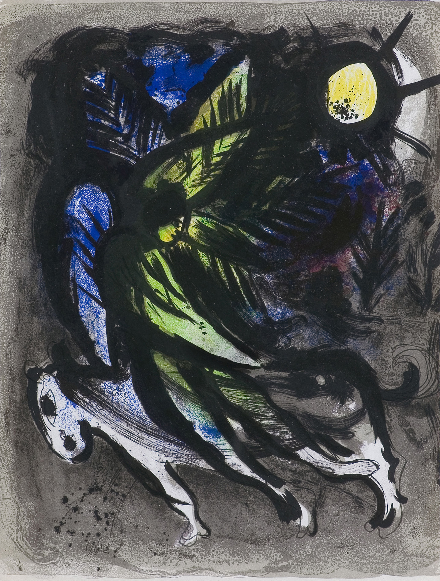 Marc Chagall uczył się rysunku u witebskiego malarza nazwiskiem Juda Pen, następnie od 1907 studiował w Akademii petersburskiej. W 1910 wyjechał na stypendium do Paryża. Zamieszkał w La Ruche na Montparnassie, wszedł do kręgu artystów, wśród których byli m.in. Modigliani, Soutine, Delaunay. W 1914 wrócił do Witebska, w 1915 poślubił Bellę (zm. 1944), muzę i bohaterkę wielu obrazów. W latach 1915-1917 mieszkał w Sankt Petersburgu, gdzie zastała go rewolucja. Mianowany komisarzem sztuk pięknych na obszar Witebska, założył tam i prowadził w latach 1918-1919 szkołę artystyczną, której profesorami byli m.in. Kazimierz Malewicz i El Lissitzky. W 1919 przeniósł się do Moskwy, gdzie do 1922 był kierownikiem artystycznym Państwowego Teatru Żydowskiego. W 1923 ostatecznie opuścił Rosję, osiedlając się w Paryżu. We Francji spędził resztę życia, z przerwą w latach 1941-1947, kiedy to schronił się w Nowym Jorku. Jego styl, wykształcony w młodości niezależnie od równoległych kierunków w sztuce, pozostał w ciągu życia artysty mało zmieniony. Wyobraźnia i sposób obrazowania Chagalla, zbliżone do sztuki naiwnej, wpisały się najsilniej w nurt surrealizmu, stając się jego znaczącym rozszerzeniem. Chagall łączył poetyckość i cudowność swych fantazji z rozwiniętym warsztatem malarza-kolorysty. Był też utalentowanym i płodnym grafikiem (cykle ilustracji do "Martwych dusz" Gogola, 1923-1927, "Bajek" La Fontaine’a, 1927-1930, Biblii, 1931-1955 – każdy cykl liczył ponad 100 plansz w technikach metalowych). Zajmował się scenografią (projekty dla Metropolitan Opera w Nowym Jorku, 1945, Opery w Paryżu, 1958), malarstwem monumentalnym (plafon w Operze paryskiej, 1963-1964), projektował witraże, dekoracje ceramiczne.