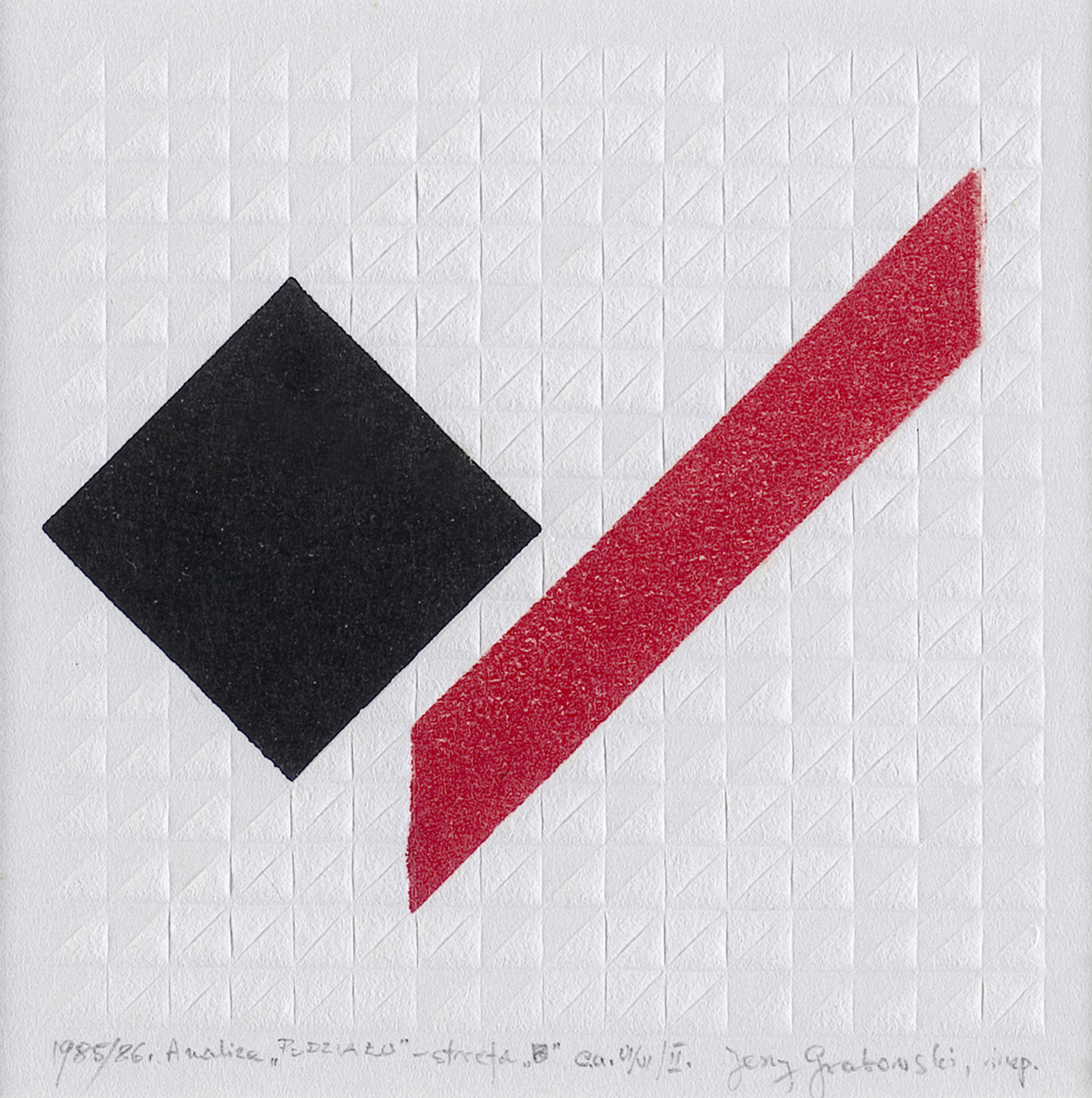 Jerzy Grabowski (ur. Gutki koło Łomży 26.IX.1933) w latach 1953-1962 studiował początkowo na Wydziale Architektury Politechniki we Wrocławiu, następnie na Wydziale Grafiki ASP w Warszawie. Dyplom w pracowni prof. Józefa Mroszczaka. Od roku 1976 był pedagogiem w PWSSP w Łodzi prowadząc pracownię druków płaskich. Od roku 1993 wykładał w Europejskiej Akademi Sztuk w Warszawie. Juror międzynarodowych biennale i konkursów, członek Międzynarodowego Stowarzyszenia Drzeworytników XYLON. Uprawiał malarstwo, grafikę artystyczną i użytkową oraz rysunek. Jego twórczość oparta jest na strukturach matematycznych. Matematyka stanowiła dla niego istotny punkt odniesienia,wykorzystywał też zjawiska iluzji wzrokowej. Najczęściej występującą formą jest trójkąt przyjęty jako najprostsza a zarazem najdoskonalsza figura, zaś system barw podporządkowany jest wartościom cyfrowym. Struktury kompozycji są otwarte, wykraczające daleko poza ramy obrazu, rozciągające się do nieskończoności. Artysta miał ponad 40 wystaw indywidualnych w kraju i za granicą. Ważniejsze nagrody; 1974 - Medal Brązowy na 13 Międzynarodowym Konkursie Rysunku im. Joan`a Miro w Barcelonie, 1979 Grand Prix - 2 Quadriennale Drzeworytu i Linorytu Polskiego w Olsztynie, 1999 - Złoty Medal - 12 Norweskie Międzynarodowe Triennale Grafiki, Fredrikstadt.