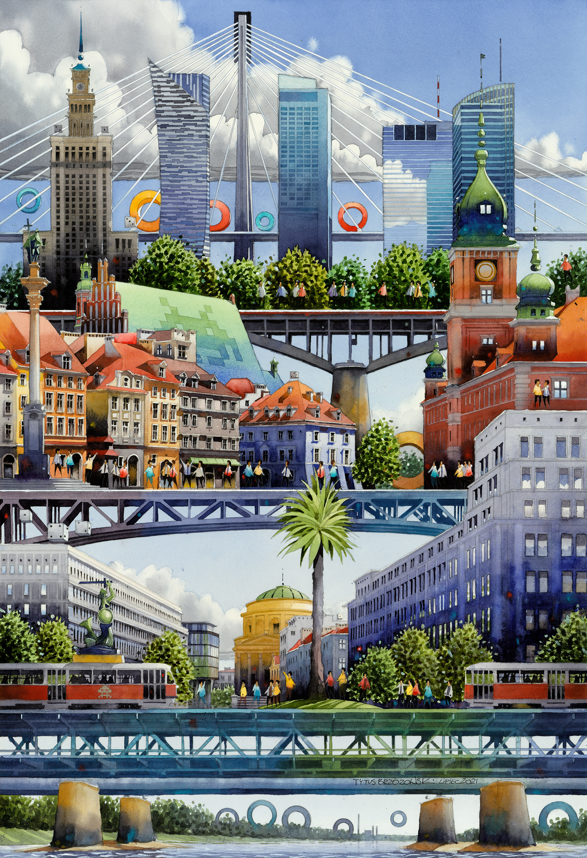Tytus Brzozowski (Warszawa 1984, mieszka w Warszawie) - ukończył Wydział Architektury Politechniki Warszawskiej, jest akwarelistą i architektem zafascynowanym duszą miasta. Często zestawia sylwetki gmachów i ludzi, tworząc barwne, pogodne sceny z pogranicza rzeczywistości i fantastyki. Jego ulubioną bohaterką jest Warszawa. Pomimo surrealistycznego posmaku, obrazy związane są z prawdziwą historią polskich miast. Artysta niekiedy wychodzi poza sferę akwareli, tak jak zrobił to na potrzeby projektów sześciu warszawskich murali, wielkoformatowej książki obrazkowej Miastonauci, a także pejzaży zrujnowanej stolicy do filmu Po apokalipsie.